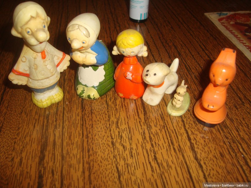 И фигурки из сказки «Репка». Мальчики дарили в каком-то начальном классе… Играла в них очень-очень часто, и совсем не по сказке… Особенно в Деда и Бабку, остальные фигурки были менее востребованы… Почему-то не сохранились сама репка и кошка, хотя была уверена, что они есть( Но очень давно их не вытаскивала, очень… Может, ребёнок влез ненароком украдкой… Может, ещё найдутся. А Лисичка не из этой сказки, но тоже фигурка того времени… Не помню откуда появилась...