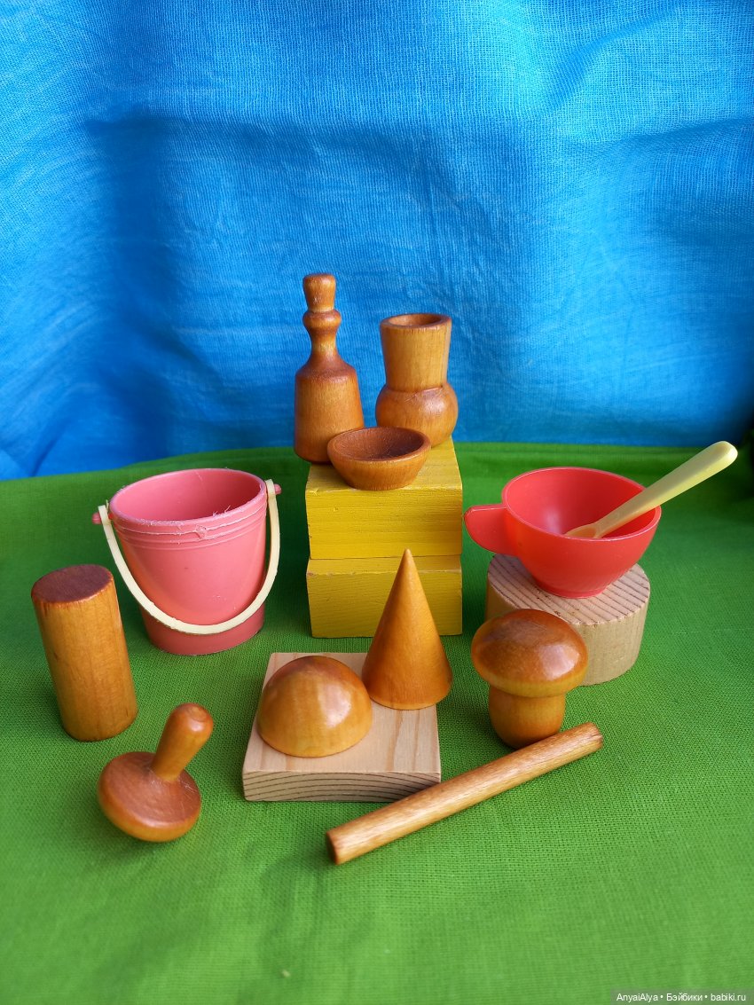 В-четвертых, кажется? Вот тут сверху в комментариях фото деревянных бутылочек, горшочков, грибок, груша — у меня тоже есть они. Это был набор «Волшебный мешочек». В тканевом мешочке лежали эти игрушки и надо было их узнавать на ощупь не глядя.
