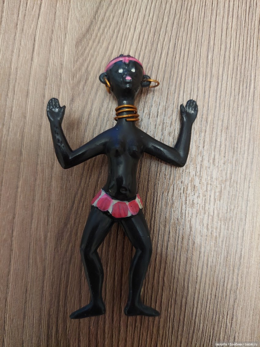 Надавно увидела на Мешке лотом ГДРовских малышей и негритянку. У меня была такая! Очень нравилась! Она довольно редкая, как все из хрупкого пластика, потому я очень обрадовалась этой, хоть у нее потеряны браслеты на руках и ногах, да и погрызена она малость… Но зато руки не обломились!