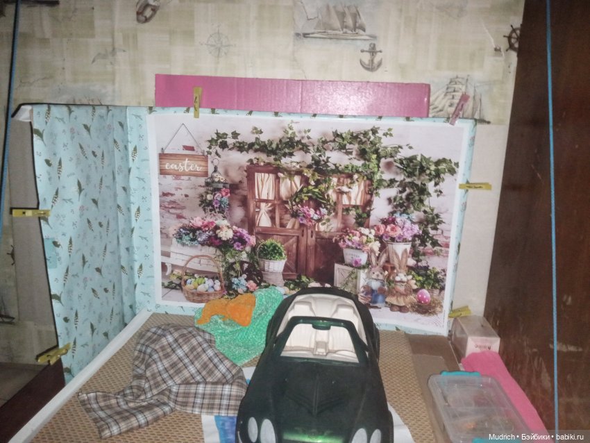 Я покрасила картон из коробок, достаточно большой фотоуголок из двух стен, как бы можно убирать, но я часто фотографирую, поэтому стоит постоянно перед комодом и рядом с шкафом для кукл.
