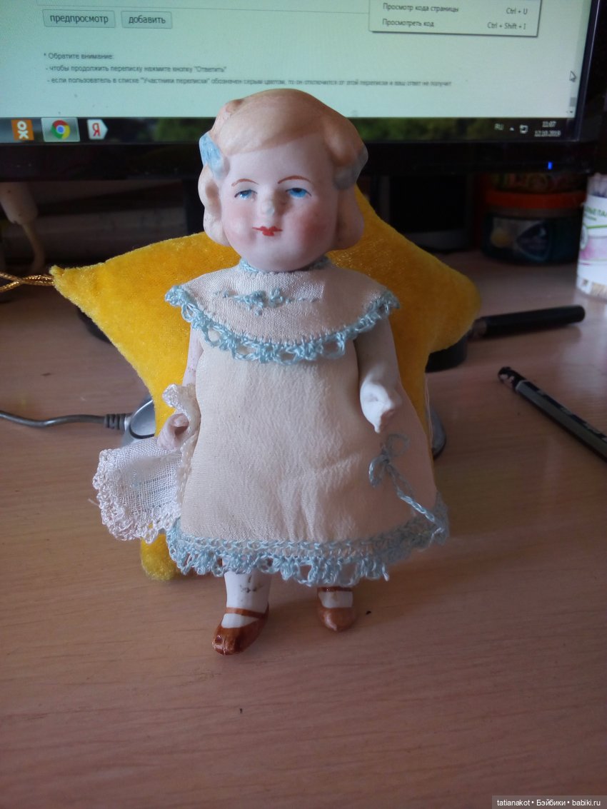 Еще у меня случилась нетипичная для меня покупка. Я не люблю фарфоровых кукол. Но тут я не удержалась. Куколка продавалась вместе с младенцем, который, по- моему, не особо старый, но зато микроскопический.) И какой- то мебелью. Это все не очень интересно. А вот она, мне кажется, старенькая. Продавец написал, что немецкая, а я в этом не уверена. Не могу найти клеймо, куда- то исчезла вся инфа по клеймам. А не японское ли оно? Подскажите, пожалуйста, кто в теме.