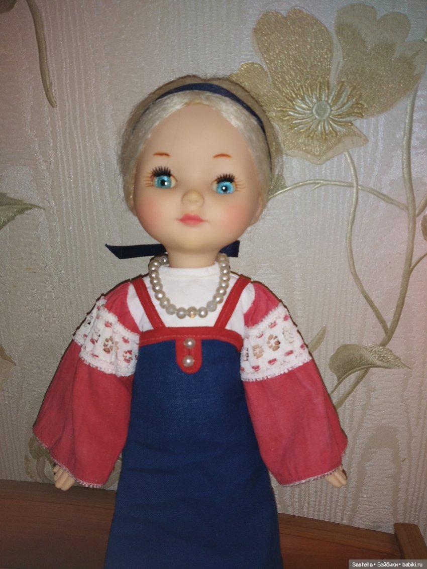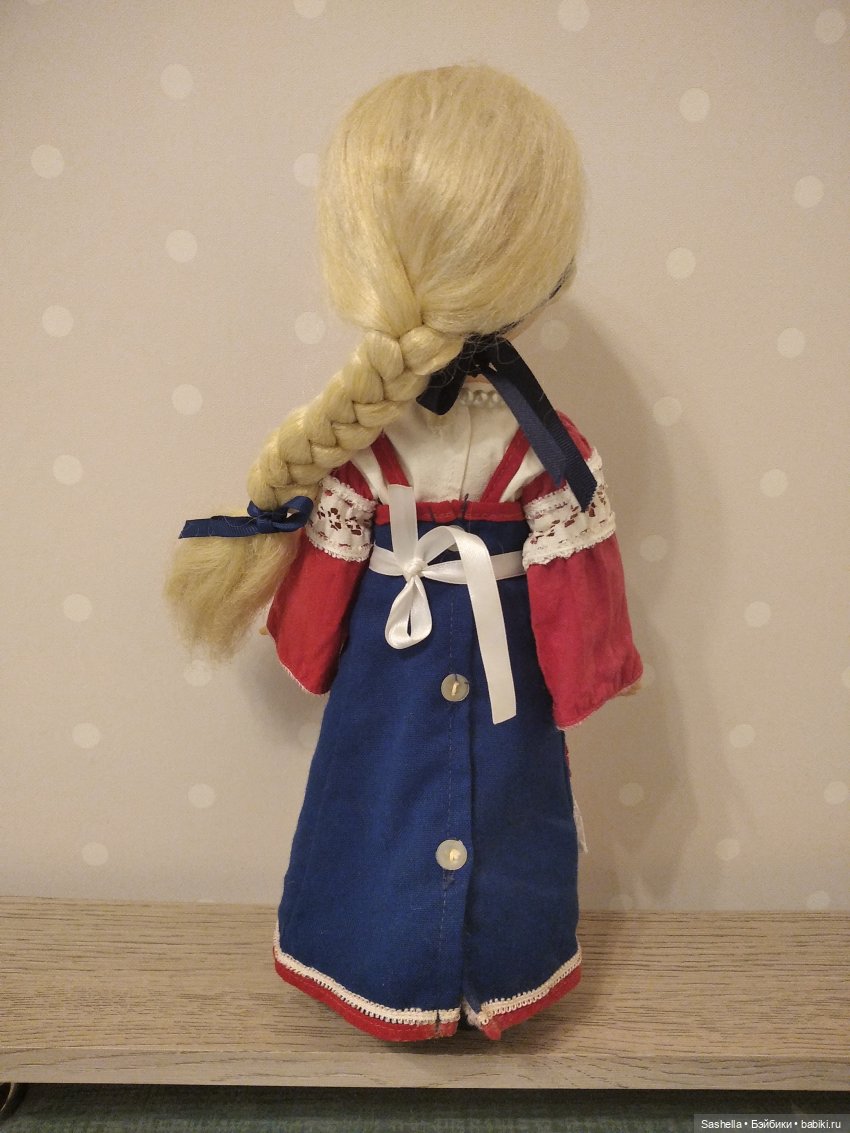 Предположу, что существовали ещё Красная Шапочка и Мальвина. У меня есть куколка с частичным аутфитом (белая шёлковая блузка с длинными рукавами). Возможно, она была как раз Красной Шапочкой. Добавила ей юбочку. Пока так, а потом, может, разживёмся «родным» костюмом.