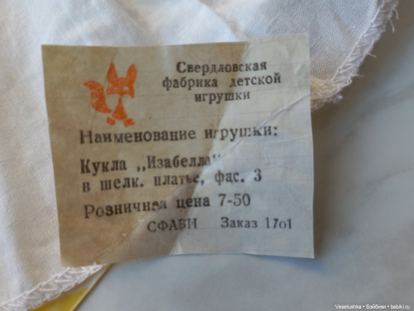 Вишенкой на торте покажу Изабеллу из 1990-х. Трудное время. Свердловская фабрика игрушек, как и многие предприятия, дышит на ладан. Прежнее уходит, новое ещё не успело появиться… Цитата из интернета: «Однажды руководство фабрики закупило в Росгалантерее грузовик пионерских галстуков. Так как пионерии тогда уже не было, то эти галстуки были убыточным товаром. На фабрике галстуки раскладывали по 10-15 слоев и шили из них платья для кукол. Из двух галстуков получалось одно кукольное платье». Так или нет, не знаю, но вот кукла в платье из ткани, точь-в-точь как пионерский галстук, у меня есть. Платье на ней сидит не очень ладно, но допускаю, что оно родное, и однозначно фабричное.
