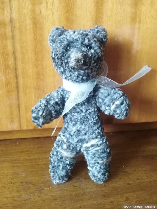 Ещё у меня в детстве был мишка из подобного материала. Какого он года я не помню, он всегда был. Он так и остался у бабушки, забрать не смогли. И вот, когда я на мешке такого увидела, то сразу же купила. Мишка из ваты на проволочном каркасе и обмотан мохнатыми нитками.