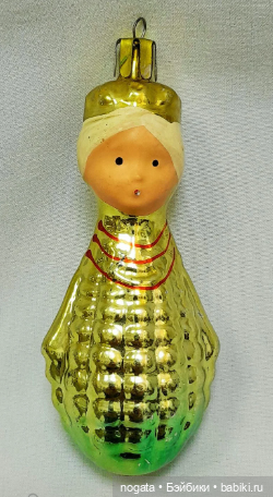 Кроме Кукурузы в разноцветных платочках Шостка выпускала и второй вариант игрушки — в богатой короне и с бусами. Настоящая королева! Но не знаю, как вам, а мне Кукуруза в крестьянском платочке как-то милее. И жена В.М. Цыбулько, создателя игрушки, на мой взгляд, намного симпатичнее своего целлулоидного «портрета».