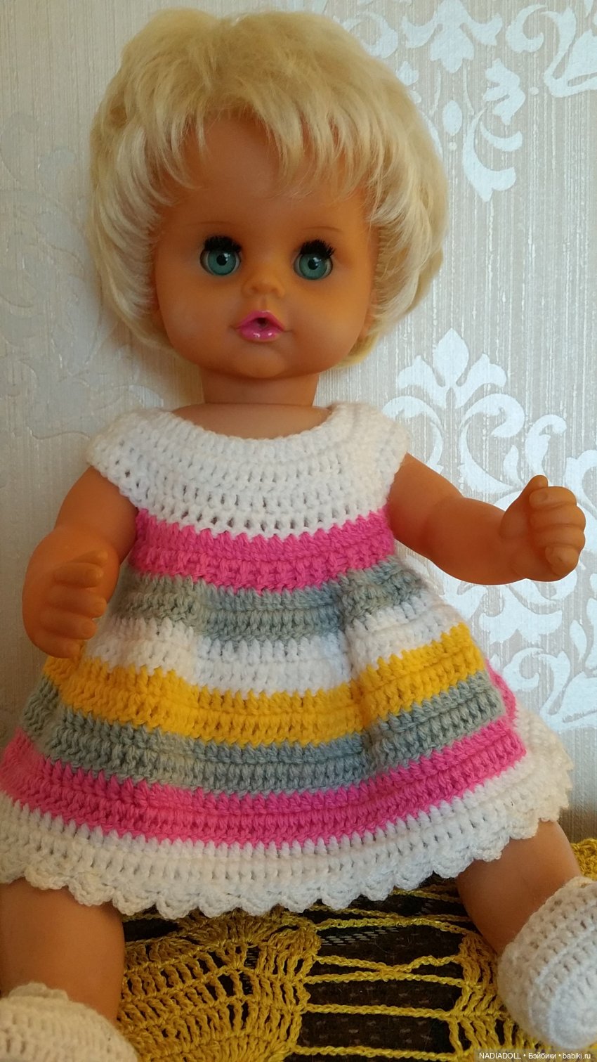 Виктория (её мама покупала лет 25 -27 назад, она стояла у нас сначала в стенке, потом уже мы с сестрой забрали её для игр, к сожалению из родной одежды остался только плащик. Хорошо, что куколка не потерялась, раньше мы несколько раз переезжали и что то было утеряно