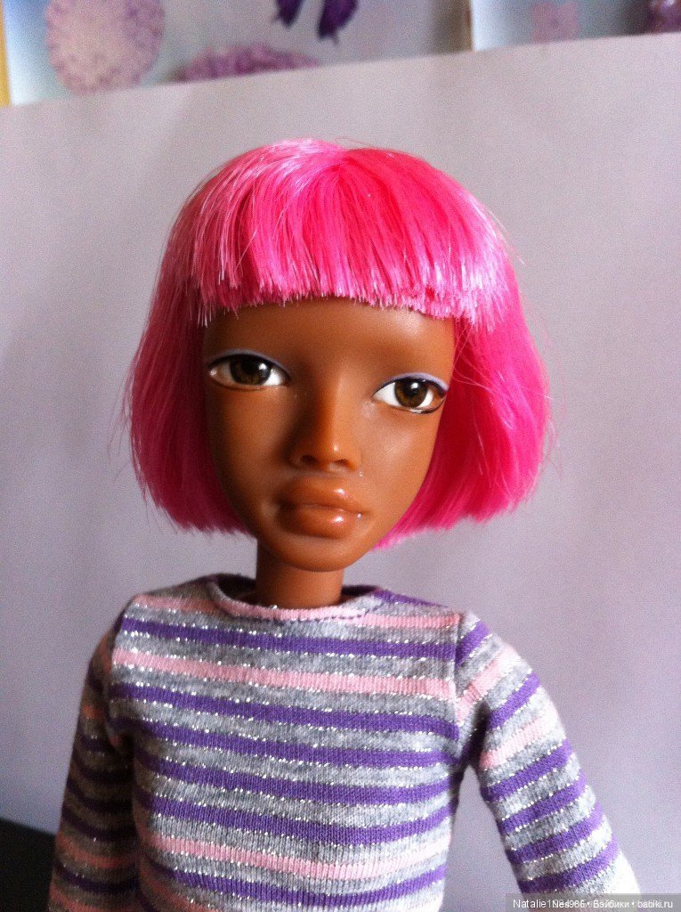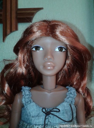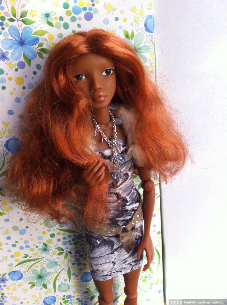 А цветные парики моя слабость, причём именно с тёмной кожей. Многие перепрошивают кукол натуральными оттенками волос вместо фабричных ярких, у меня всё наоборот. Но мукольная классика, челки, длинные волосы или мониковский паричок Jade пшеничного цвета это особый шик. Плюс мукол в том, что им можно снять парик и стереть мейк и они по-прежнему будут прекрасны. Минус в том, что при всей их условности им идёт только человеческая одежда, никаких аутфитов от кукол. Им надо шить, из коробки не подберёшь)