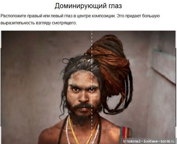 Тут эффект выразительного взгляда достигнут не потому, что «глаз по центру», а, в первую очередь, потому что вся голова человека является несимметричным объектом из-за прически. И ее нужно было смещать в любом случае, а глаз по центру уже встал в рамках этой необходимости — т.е. действительно усилил эффект при построении композиции кадра. Но если бы асимметрии главного объекта в кадре не было, то размещение лица таким же образом дало бы дискомфорт при взгляде на снимок, т.к. это было бы просто неубедительно помещенное в кадре лицо.