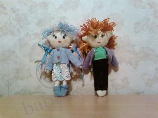 Я своим куколкам волосы прошивала, если так можно назвать. В качестве волос брала очень толстые нитки для вязания и пришиала их обычной швейной иглой к голове куклы. потом ещё эти толстые нити расплетала на тонкие, причёска распушилась. Глаза вышивала на кусочке флизелина, а потом приклеивала на лица. Куколки получились очень весёлые. Кофточки у обоих из флиса, брючки у мальчика из вельвета. Носочки на девочке связны спицами.