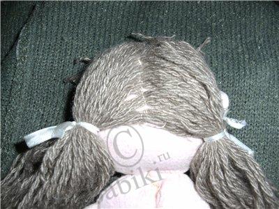 — Складываем пряжу, как показано на фото ниже и прикрепляем к голове куколки.(приклеиваем)