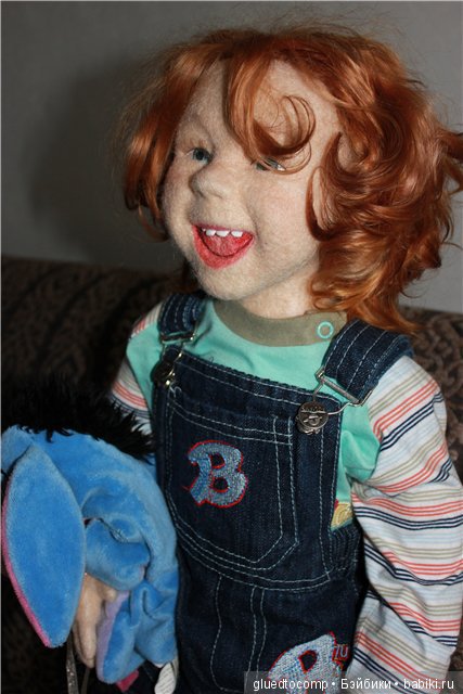 Но Степана я уже не могу предлагать. Я его в самом начале переделала под себя. То есть он был сидячим, сейчас он стоячий на каркасе. Тело не идеально сшито. Плюс — он тоже как Сашок анатомически корректный стал. А минус — его Персик успел подмочить. То есть абсолютно свой парень. И к тому же он у меня слегка на Жерара Депардье смахивает. А звёзд я не предлагаю, даже при наличии паспорта. Он ему уже не соответствует.