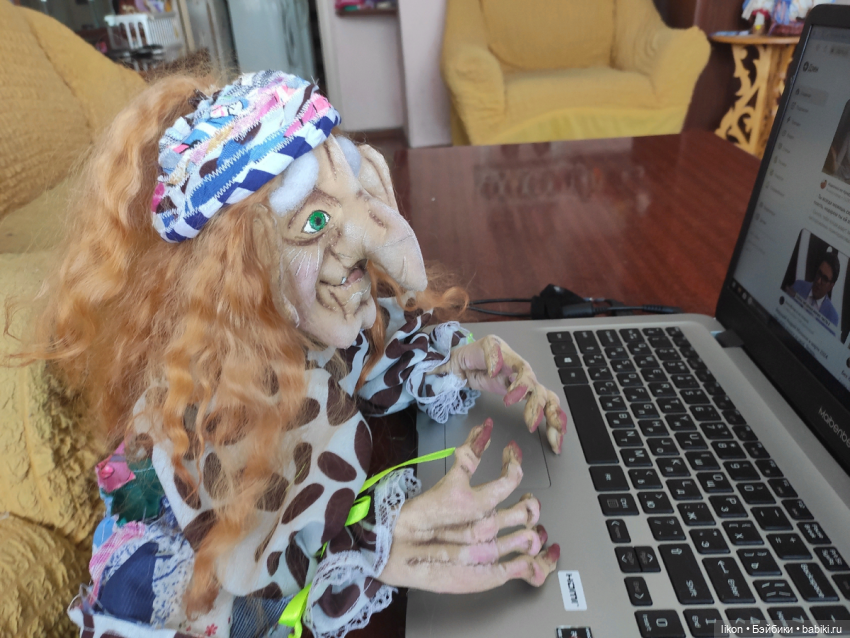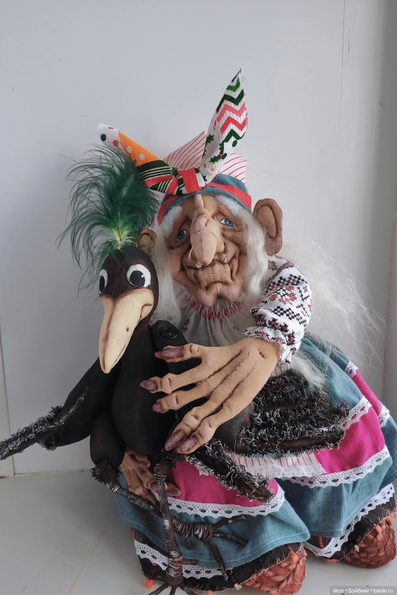 Раньше хоронили умерших в лесу в специальных доминах стоящих на столбах, чтоб звери не погрызли. От сюда и сравнение с избушкой на курьих ножках и в сказках часто встречается описание, что у Яги «нос в потолок врос», длинные волосы, неопрятная, что напоминает, лежащего в гробу… Много разных предположений. Именно поэтому, этот образ так интересен многим кукольникам.