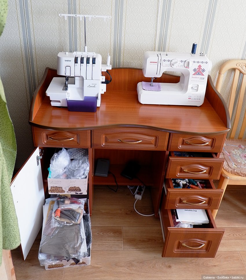 В шкафчиках-ящичках швейного столика хранятся нитки-иголки, резиночки-тесёмочки, а также «сапожный товар» для изготовления обуви.