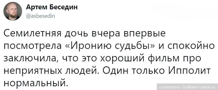 Фильм люблю, хотя мне всегда было жаль Ипполита( И вообще мне лично сложно было понять, как можно предпочесть Яковлеву Мягкова)) Ну да ладно) Надо сказать, Барбара Брыльска в каком-то интервью сказала, что ей ни один, ни другой не нравился, она предпочитает другие типажи))