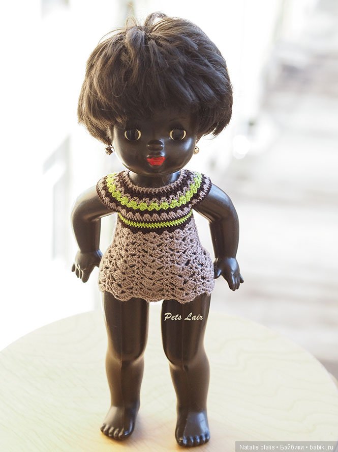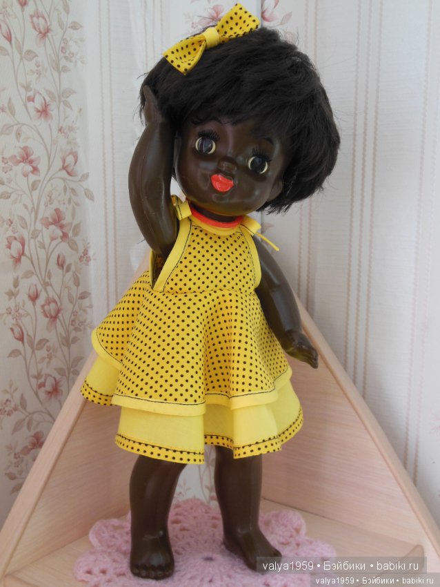 Совсем недавно, всего пару месяцев назад я погрузилась в мир кукол. Снова, через 40 лет… Купила себе для одевания-шитья-вязания-валяния-обувания две куклы фабрики Весна. Потом еще две… потом Паолу — Кристи… И тут моя мамочка мне сообщает, что у нее на антресоли лежит (уже более 40! лет) кукла — негритянка. Вот, говорит — думаю — выкинуть, или нет… Мамочка, конечно нет! Залезла на антресоли, в самом дальнем углу лежит, бедняга… резинки все растянулись, голова висит, волосы спутались, пыльная, вся в царапинах, и на личике, причем, самые сильные. Губы ярко-красные облупились. в общем, я тоже задумалась — смогу ли привести в порядок…
