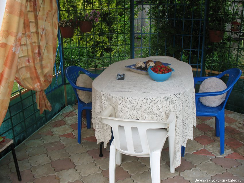 Та, что в открытой всем ветрам беседке (только крыша сплошная) с мая месяца скатерть не испачкалась.