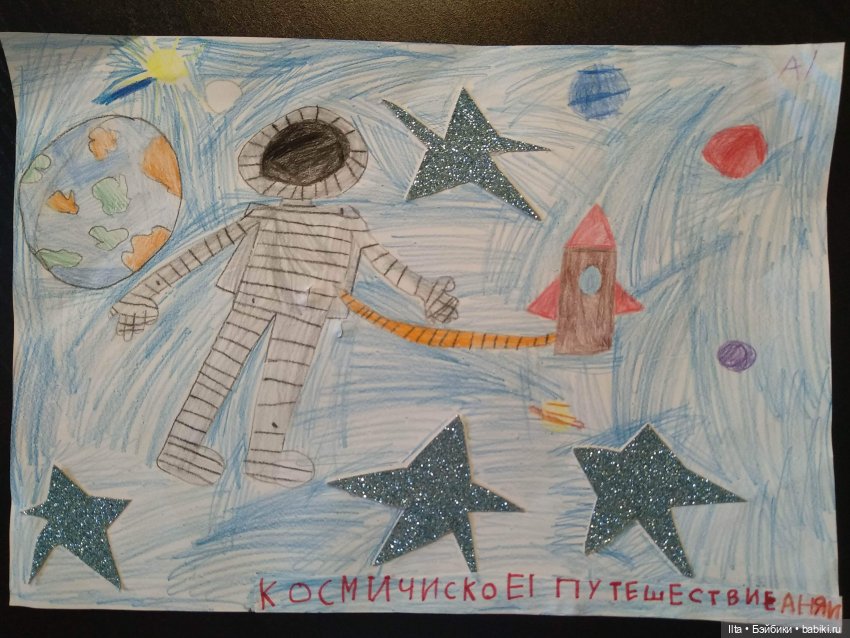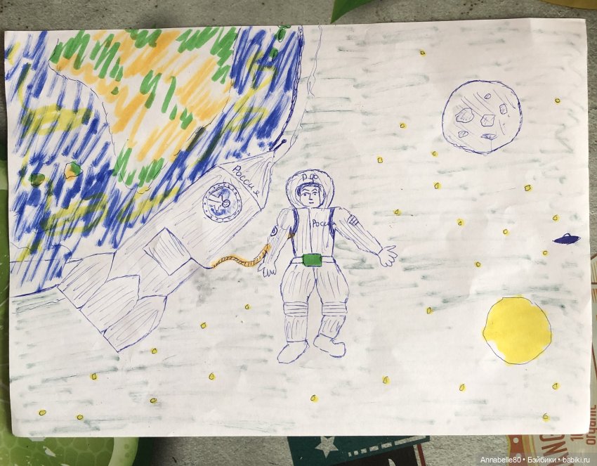 Сейчас тоже проводят конкурсы и выставки, посвящённые дню космонавтики. В детском саду у среднего сына, несмотря на то, что все сейчас сидят дома, провели виртуальную выставку рисунков, поделок и костюмов. Сын с папой нарисовали вот это: