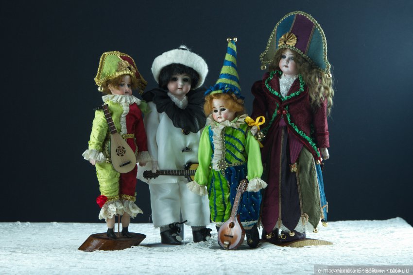 Здравствуйте, дорогие сомышленицы.Сегодня мне хочется поделиться с вами своим увлечением, средневековым театром Дель Арте.Долгое время я собирала коллекцию от кукол персонажей этого театра, некоторых заказывала мастерам — кукольникам, некоторых находила по объявлениям о продаже и т. д.Коллекция все еще не полная, продолжаю пополнять ее, но хочется показать то, что удалось собрать и немного рассказать о самом театре.Дель Арте — это средневековый западно-европейский(преимущественно французский) народный театр бытового сатирического характера 14-16 века.В 14-16 веках площадный плебейский фарс выделяется в самостоятельный театральный жанр.Его корни уходят в карнавальные игры, оттуда и яркие костюмы и маски.С самого начала в фарсе (фарс в переводе с латинского значит начинка)начали различать социальную критику, направленную против феодалов, бюргеров и, даже, против церкви.Веселые представления устраивали организации, которые состояли из студентов, мелких судейских чиновников, городской богемы. Только в Париже было 4 таких организаций.Они не боялись высмеивать епископов, судей и даже королей.В ответ на это светские и церковные власти преследуют фарсеров, изгоняют их из городов и даже бросают в тюрьмы.Героем фарса стал пройдоха горожанин, его хитроумные проделки посрамяли сильных мира сего и утверждали преимущество ума, ловкости людей из народа.Фарс оказал большое влияние на дальнейшее развитие театра Западной Европы.В Италии из фарса родилась комедия Дель Арте, высшее достижение итальянского театра эпохи Возрождения.Своим происхождением народный театр обязан актером, выработавшим у себя способность к импровизации, без помощи написанного текста, ведь многие из них не могли писать и читать.Бродячие труппы актеров выступали в Франции, Испании, Италии, Англии.Их творчество оказало влияние на прогрессивных драматургов, режисеров, в частности на творчество Мольера и др.У комедии было два основных центра- Венециа и Неапаль, в соответствии с этим сложилось два вида масок(персонажей).Венецианские — Доктор, Пантолоне, Бригелла, Арлекин.Неаполитанские -Ковьелло, Пульчинелла, Скарамучча, Торталья.В комедии Дель Арте артисты использовали маски, закрывавшие лицо или полностью или наполовину, само название дель арте- комедия масок.Делались маски из клеенки или картона, были такие персонажи (Пьеро), которые вместо маски обсыпали себе лицо мукой.Выбрав маску, актер не расставался с ней всю свою жизнь. Совершенно исключалось возможность, чтобы актер сегодня играл одну роль, а завтра другую.Так, в 18 веке знаменитый актер Антонио Сакки играл роль Труффальдино до глубокой старости.В случае, если в труппе не было исполнителя какой нибудь маски, эта маска исключалась из сюжета.Комедия Дель Арте имела три группы масок. Первая группа — народно-комедийные персонажи слуг-Дзани(Бригелла и Арлекин), служанки(Серветта, Коломбина). Именно слуги были душой театра. Вторая группа-господа(глупый купец Пантолоне, бахвал и трус Капитан, тупица и болтун Доктор).Третья группа — влюбленные.Борьба за любовь молодой пары составляла главное содержание спектаклей.Молодая любовь постоянно наталкивалась в лице на масок господ на всяческие преграды и с помощью масок слуг в конце побеждала.Каждый персонаж носил свой собственный костюм. Дзани были одеты в белые, ш