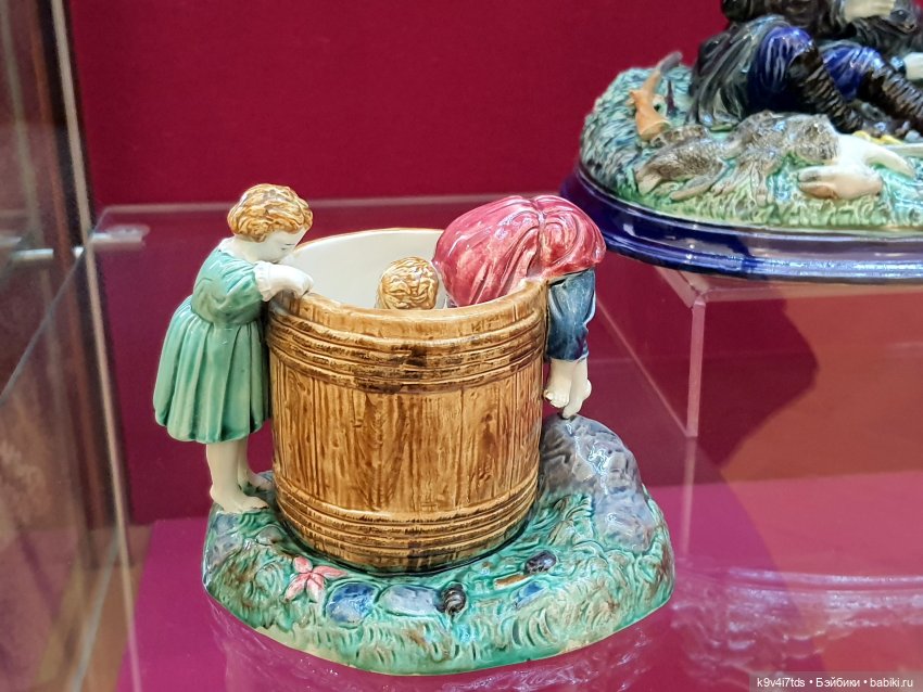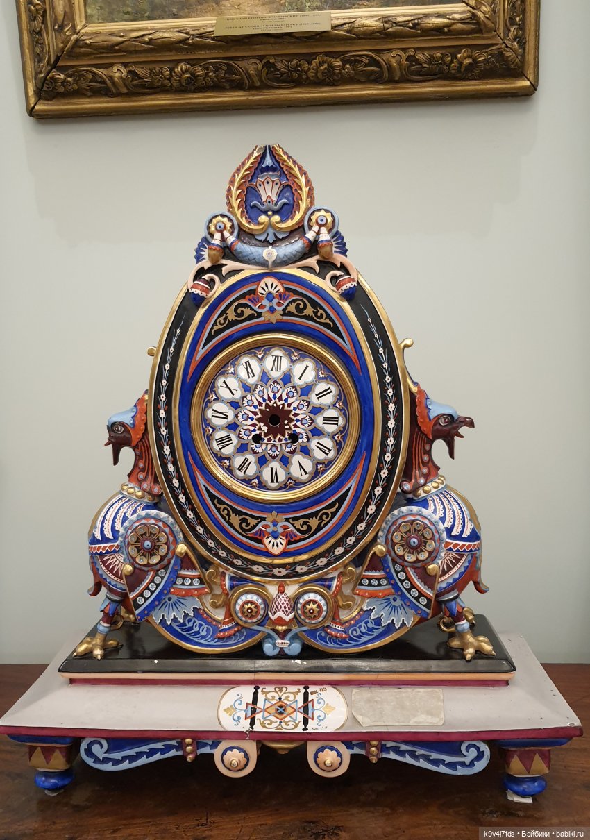 Вот ещё такой интересный экспонат: Часы. Конец XIX века. Фабрика М.С. Кузнецова, Тверская губерния. Фаянс, цветные глазури, надглазурная роспись, позолота, люстр, рельеф.