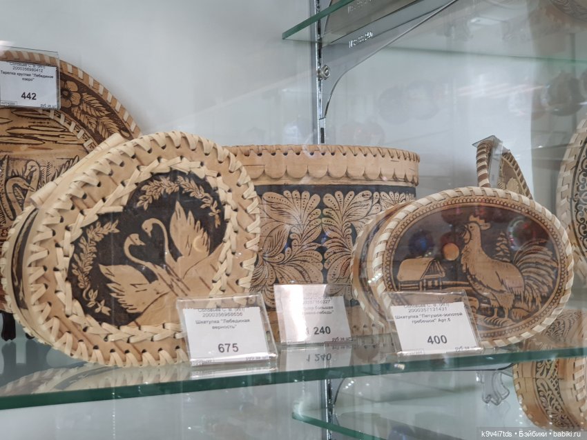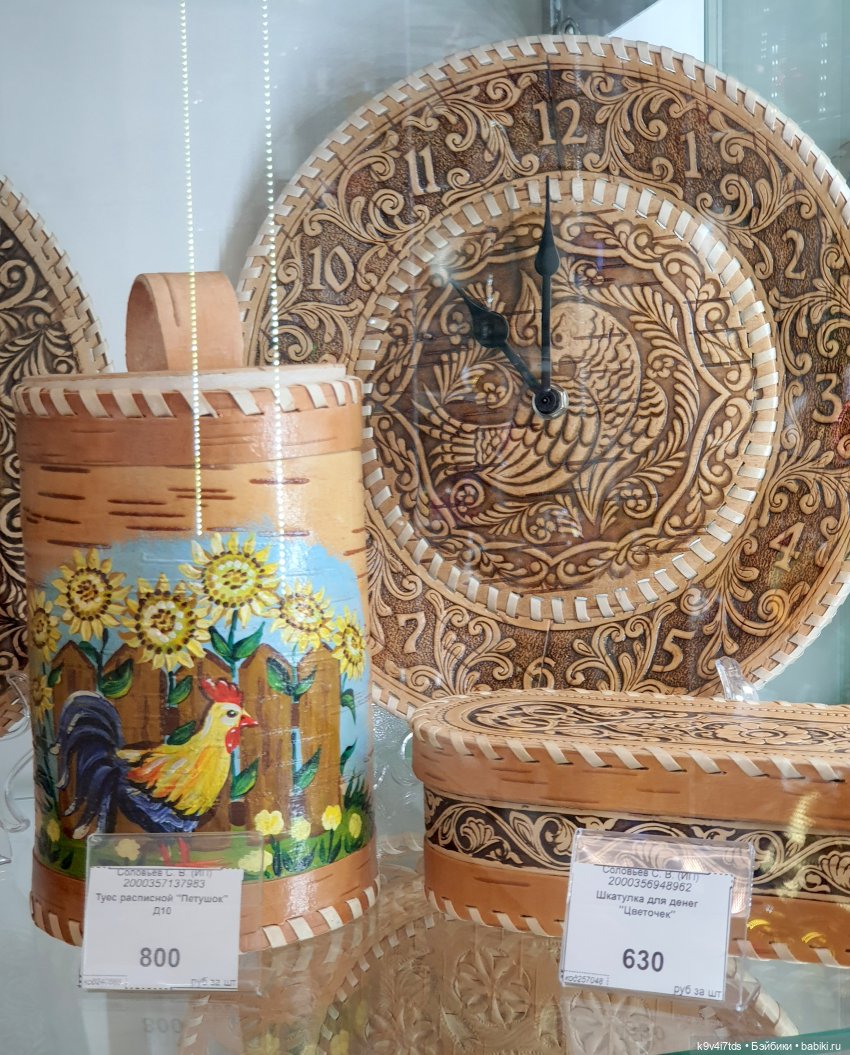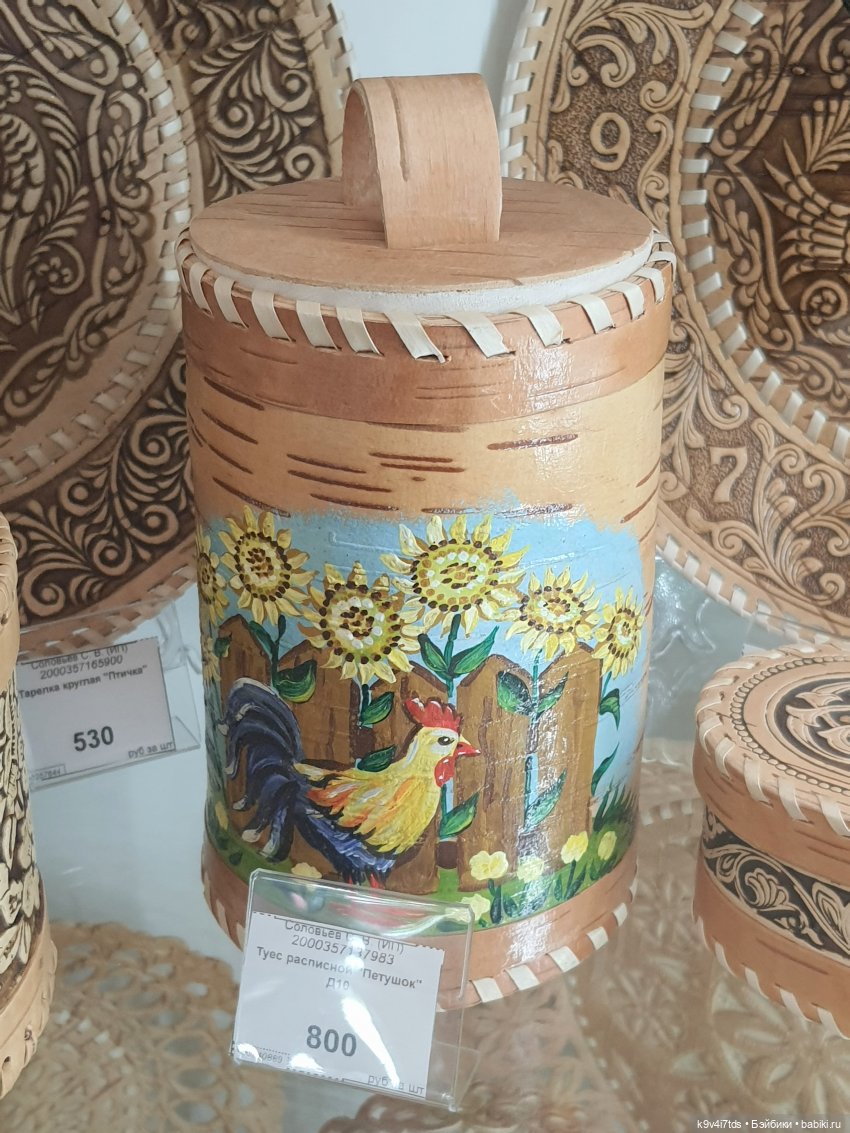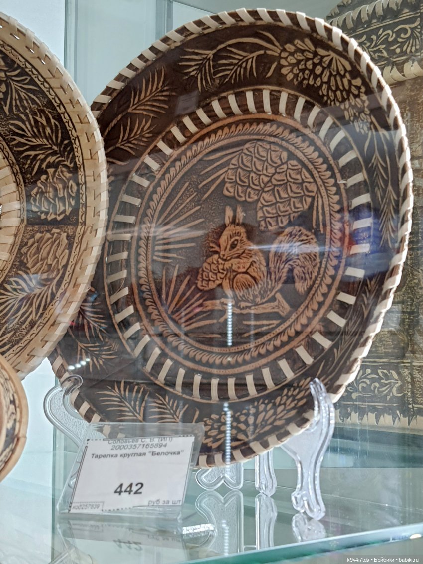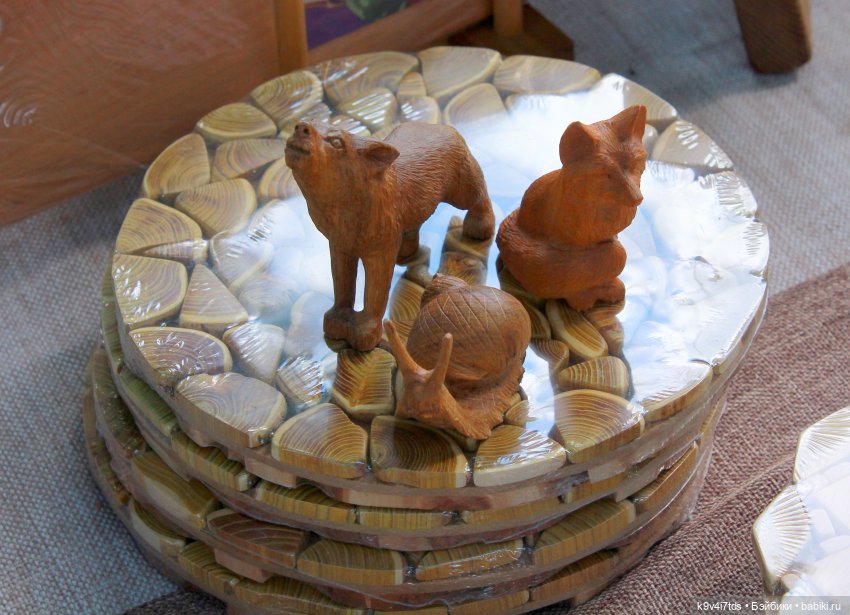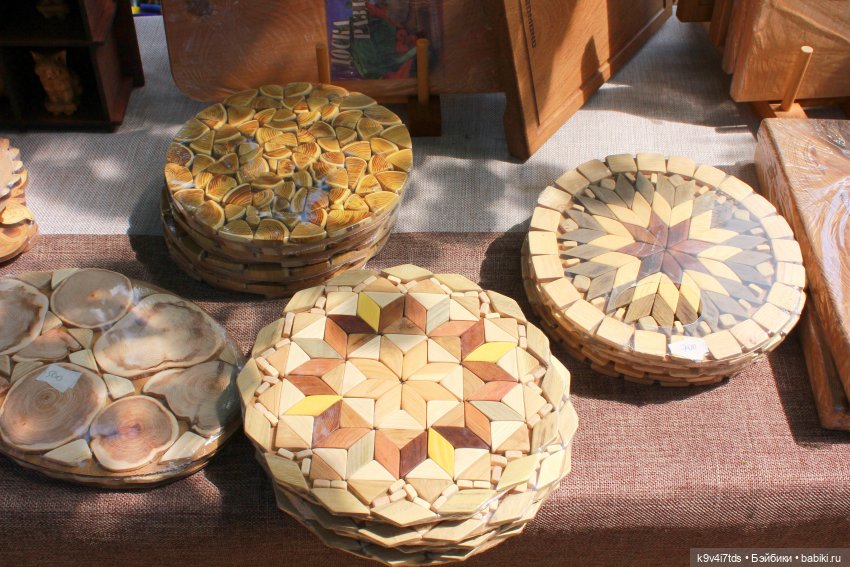 В этой — круглые деревянные досточки и рисунки на деревянных планочках.
