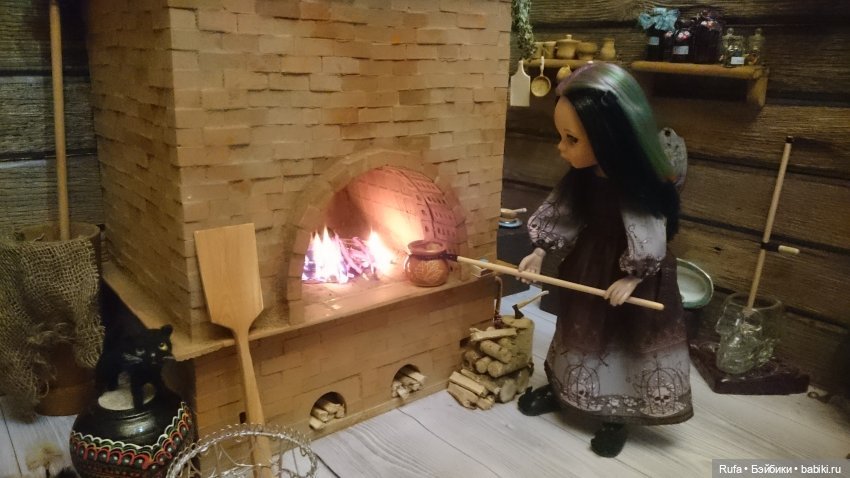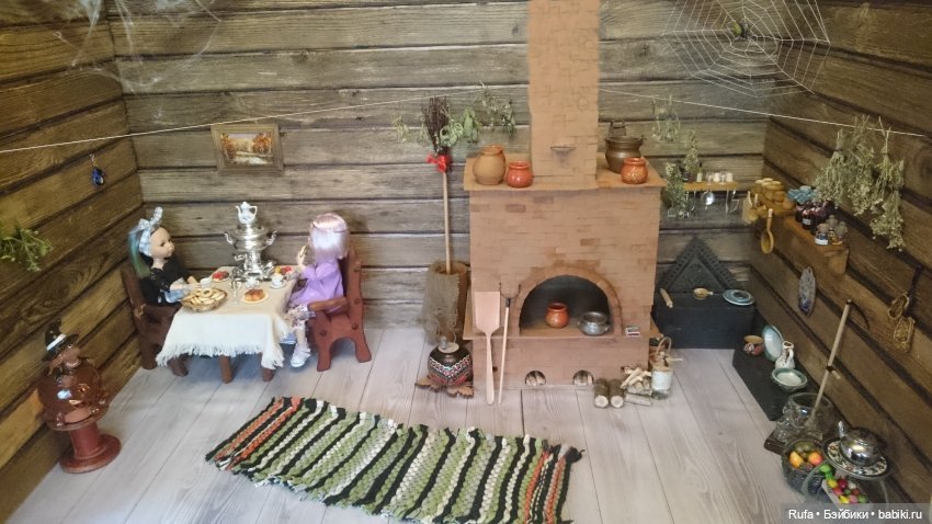 Я очень долго собирала всякую мелочь, так как куколки были 34 см. Ваша Нина крупная. Я прочла что всё на фото настоящее. Как же Вы ухитрились сиять так, что всё атрибуты не кажутся несоразмерными?? Корытце для рубки капусты небольшое и за корыто вполне сошло. А горшки и утюг? А стены? В моей сказке муж специально сделал доски пропорционально куклам. Даже печь складывали из крошечных кирпичей.