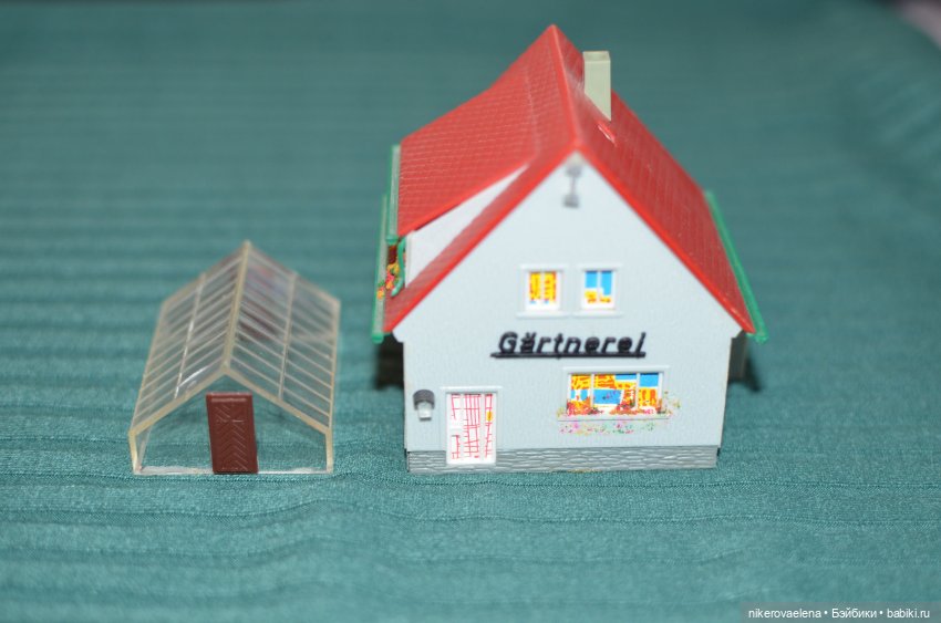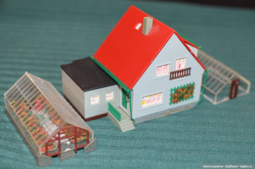 А у Вас — как раз то, что было у меня! Вот это он и есть — дом с оранжереями! Это такое чудо было, прозрачные пластмассовые оранжереи… (То, что я вспоминала как «три этажа с гаражом», этажей не 3, оказывается, просто он большим кажется, но гараж же рядом есть?) )И еще два домика с деревьями — это как дачи с заборчиками, обклеивала кроны этих деревьев губкой, помню. Они!!!