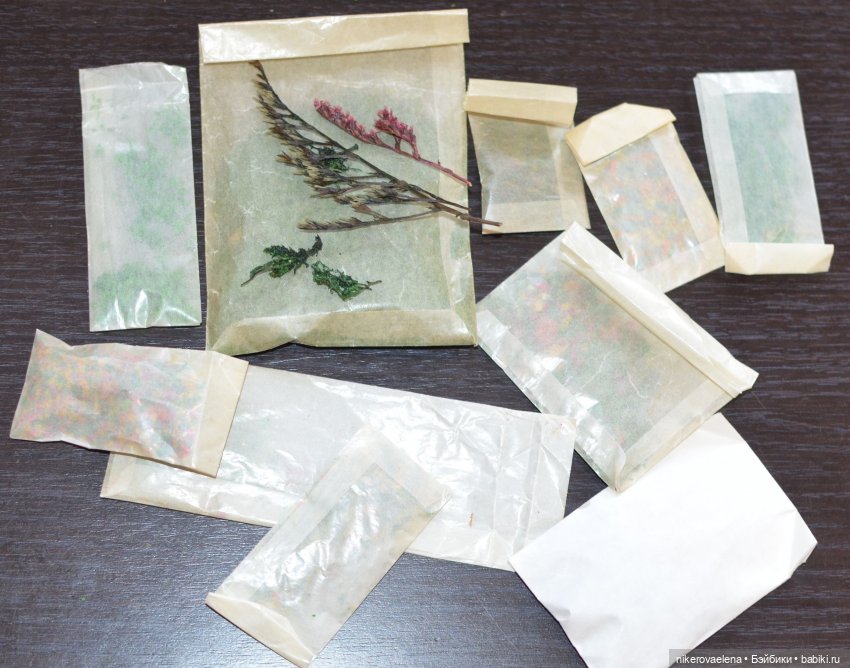Пакетики с зелеными насаждениями из клочков цветного поролона или крашеных опилок или мха. Иногда настоящие засушенные растения!