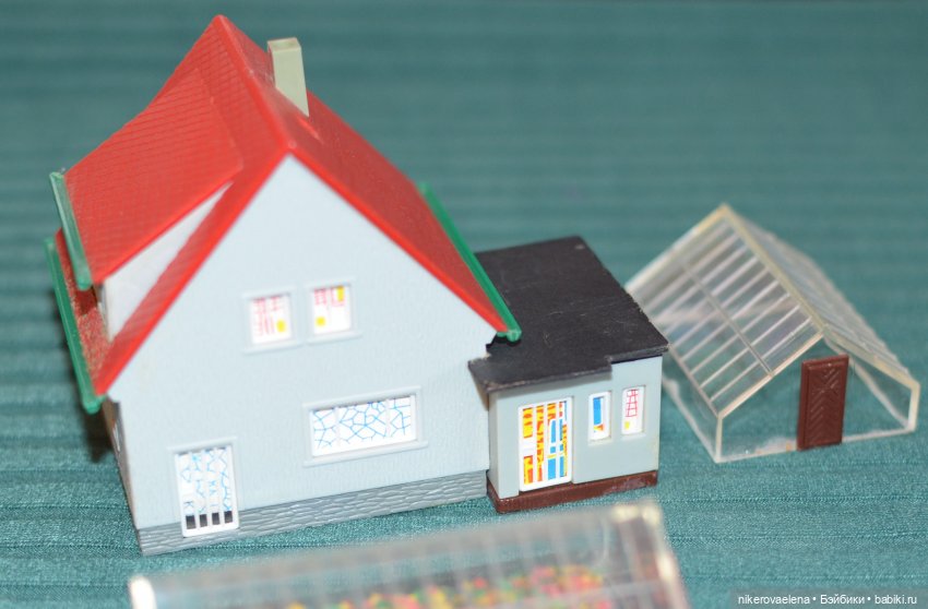 Раньше эти домики располагались на плотном пластмассовом основании, которое позволяло создать законченный дачный ландшафт. Но со временем оно покоробилось, до такой степени, что вписать его можно было только в горку, но строения-то там были перпендикулярны основанию :( Смотрелось странно, пришлось разобрать.
