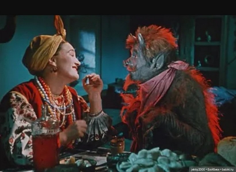 … Спереди совершенно немец: узенькая, беспрестанно вертевшаяся и нюхавшая все, что ни попадалось, мордочка оканчивалась, как и у наших свиней, кругленьким пятачком, ноги были так тонки, что если бы такие имел яресковский голова, то он переломал бы их в первом козачке. Но зато сзади он был настоящий губернский стряпчий в мундире, потому что у него висел хвост, такой острый и длинный, как теперешние мундирные фалды; только разве по козлиной бороде под мордой, по небольшим рожкам, торчавшим на голове, и что весь был не белее трубочиста, можно было догадаться, что он не немец и не губернский стряпчий, а просто чёрт, которому последняя ночь осталась шататься по белому свету и выучивать грехам добрых людей. Завтра же, с первыми колоколами к заутрене, побежит он без оглядки, поджавши хвост, в свою берлогу.