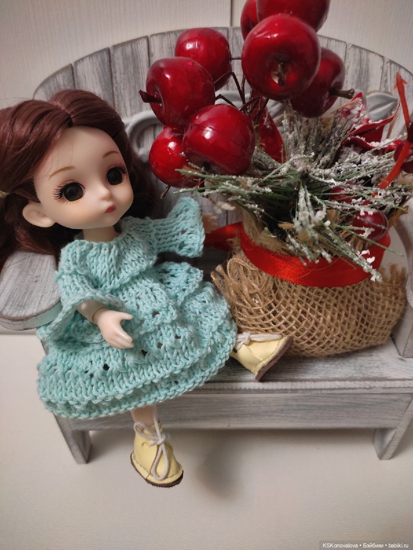 Первые наши куколки одевались в связанные мною наряды… Казалось мне, КАК(!) можно вязать на таких крошек??? Нитки, кстати в этой вязке использованы годов 90-х. Ужасно неудобные! Но вот вязали же тогда из них и радовались!