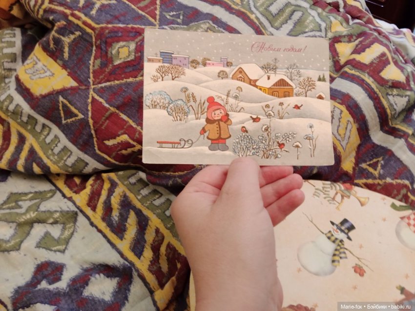 Ох, как же я гордилась, что Дед Мороз такой энергичный! По картинкам я «понимала», что у него много работы перед праздниками, и следила за действиями Дедушки, разложив новогодние открытки. Он и на письма детишек отвечает, и почту развозит, и снегом дворы заваливает, и открытки разносит). Энерджайзер, а не Дед Мороз.
