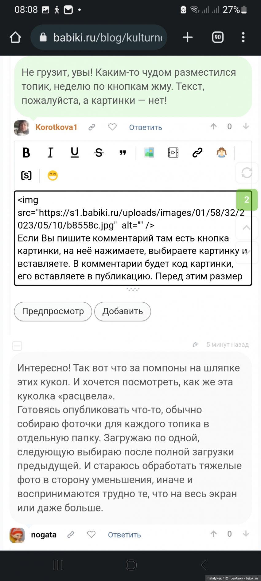 Если Вы пишите комментарий там есть кнопка картинки, на неё нажимаете, выбираете картинку и вставляете. В комментарии будет код картинки, его вставляете в публикацию. Перед этим размер картинки уменьшаете до 900×1200, или сколько там самое небольшое? Или чуть больше, чем не большое, в любом редакторе, хоть даже встроеном на телефоне.