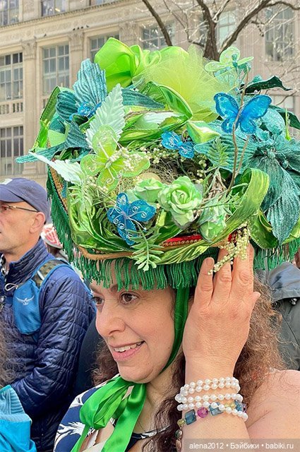 Другая дама из Балтимора появилась на пасхальном параде 1982 года в огромном пасхальном головном уборе. Из ее головного убора, прикрепленного к широкополой шляпе, выглядывают гигантские плюшевые кролики, плетеные корзины и соломенные цветы.