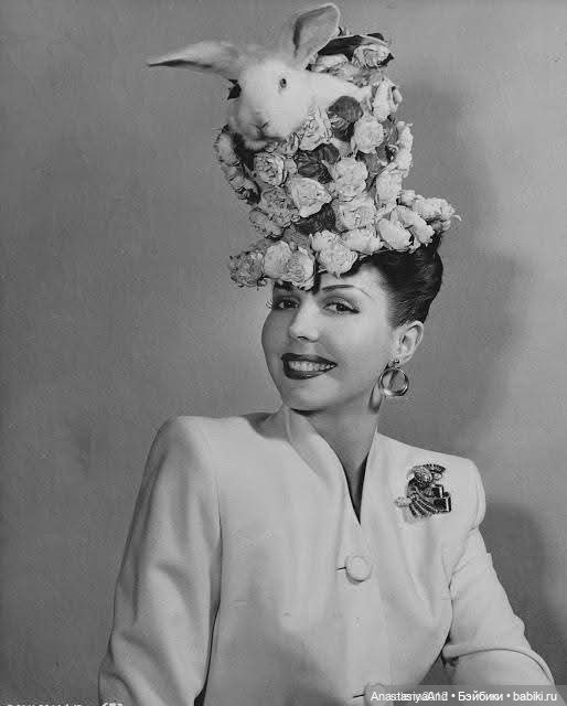 Наконец, пасхальный головной убор американской танцовщицы и актрисы Энн Миллер 1947 года. Цилиндр покрыт яркими цветами, а из него только что вылез огромный белый кролик.