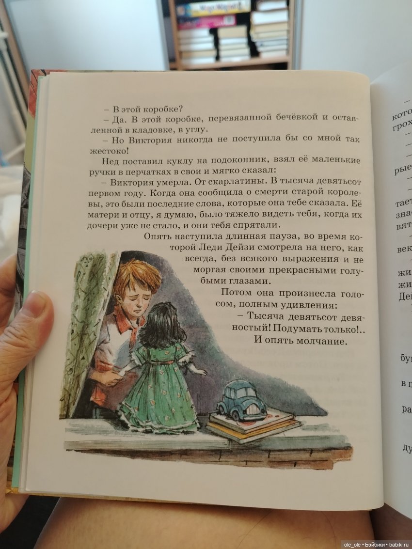 Я не буду пересказывать весь сюжет. Книга написана очень просто, ее легко прочитать за день. С ребенком – дня за три-четыре. При своей легкости, меня каждый раз удивляет, сколько важных недетских тем она затрагивает: вопросы владения – кто распоряжается игрушкой, если у нее есть какая-то материальная ценность; что такое “заповедное имущество” – неотчуждаемая семейная собственность. Что значит быть “настоящим мужчиной” – как научиться отстаивать свои интересы, защитить себя, взять на себя ответственность за кого-то. Очень деликатно поднимается тема утраты и неизбежности смерти. А еще книга о чувстве семейной общности и значимости семейной истории: выясняется, что прежней хозяйкой Леди Дейзи была пятилетняя сестра прадеда Неда, которая в 1901 году умерла от скарлатины. То есть кукла — это настоящая фамильная реликвия, хотя у современной семьи нет к ней никакой эмоциональной привязанности, потому что тогда ее сразу убрали с глаз долой на чердак, где она и пролежала, забытая, 89 лет.