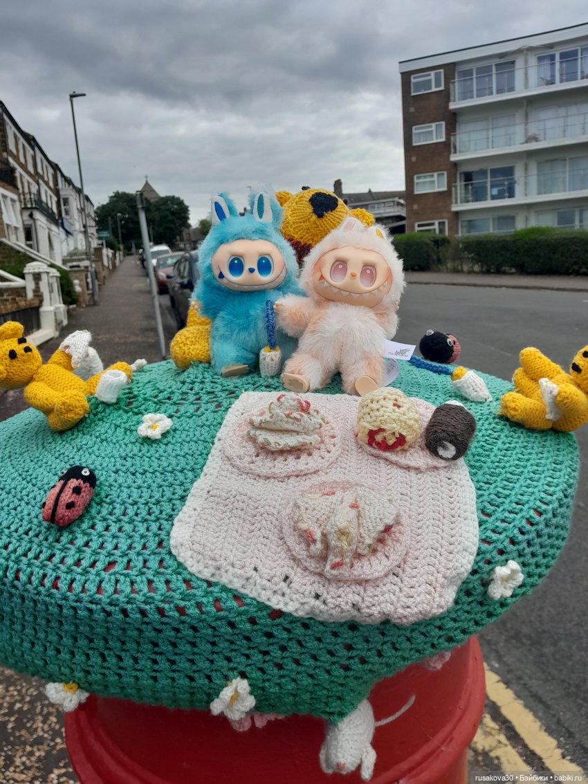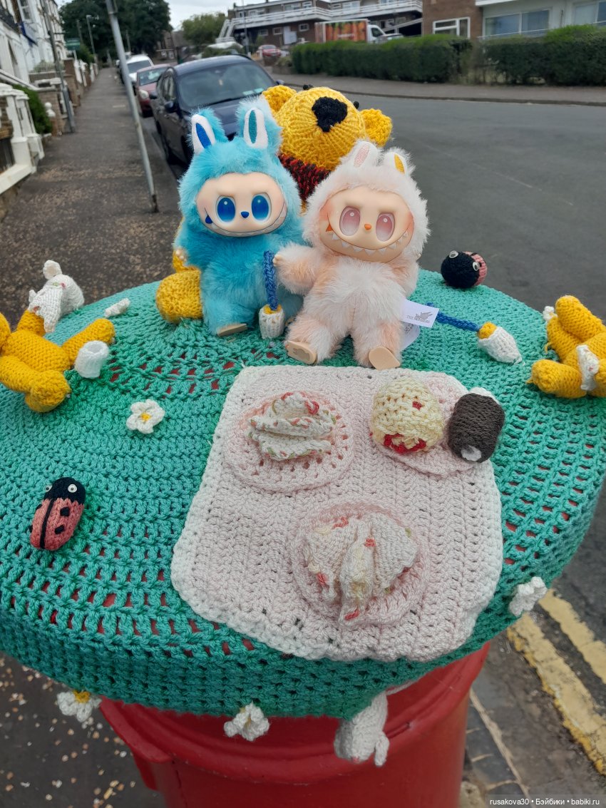И лабубикам повезло — в конце попали на кукольный пикник вязанный на почтовом ящике — и угощение, и гости спешат со всех ног)))