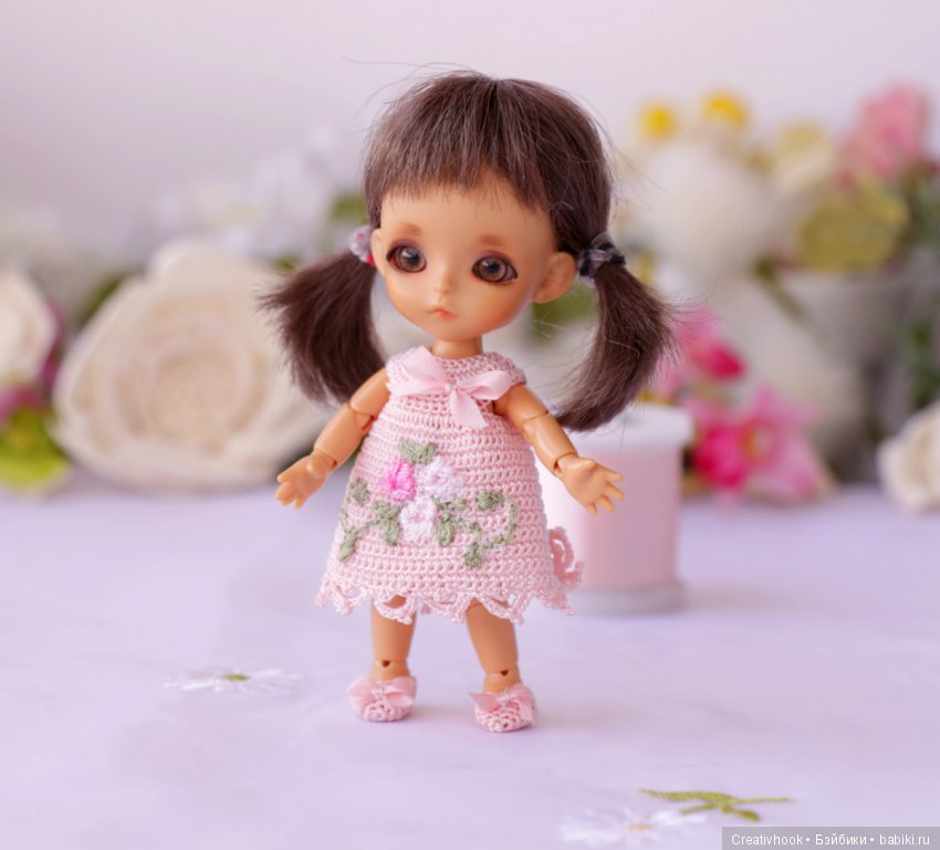 За время ожидания успела сшить нарядик и приготовить паричок. А по прибытии куколки, даже сшила микро ботинки. Не ходить же ребенку босиком. Макияж тоже сделала сама.