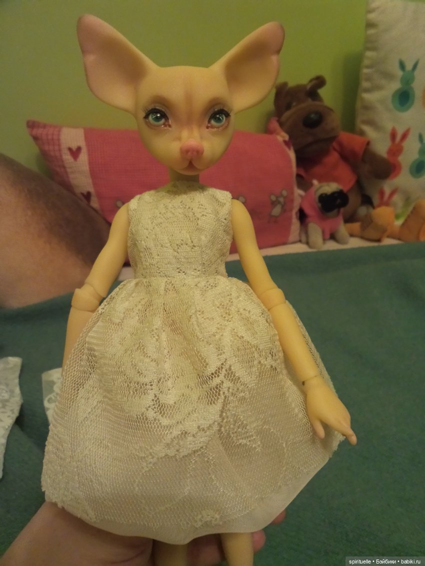 А давайте поговорим о «странных куклах». Странных именно для нас, ибо для других они, как раз таки может самые обычные)) Дело было так: здесь в шопике я увидела собаку. Что такого, скажете вы, экая невидаль)) А суть в том, что лично я не воспринимала кукол с человеческим телом и головой животного. Вот не «заходили» они мне, ну никак. И я всегда с уверенностью думала, это не мое! Как бы не так! Эта собака заглянула в душу своими чёрными глазками, заронила туда зерно сомнения и в течении всего периода внутренней борьбы (тут, я уверена, многие поймут о чем я)) подталкивала меня своим длинным носом, типа, не сомневайся, бери, я тебе нужна!!! И что вы думаете?? Приехала! Вся такая, бееедненькая, скромненькая, хорошенькая)))