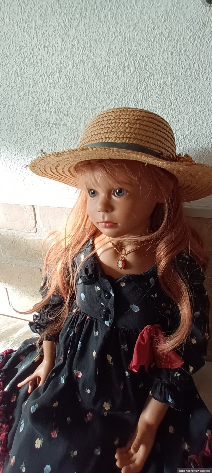 У меня живёт виниловая девочка этого автора. Вот тоже, о наряде: платье легкое, и тяжелая черная шляпа… я поменяла на соломенную, антикварную шляпку. Мне так нравится гораздо больше. А форма ручек, пальчиков кажется, у Вашей куколки и моей — одинаковые.