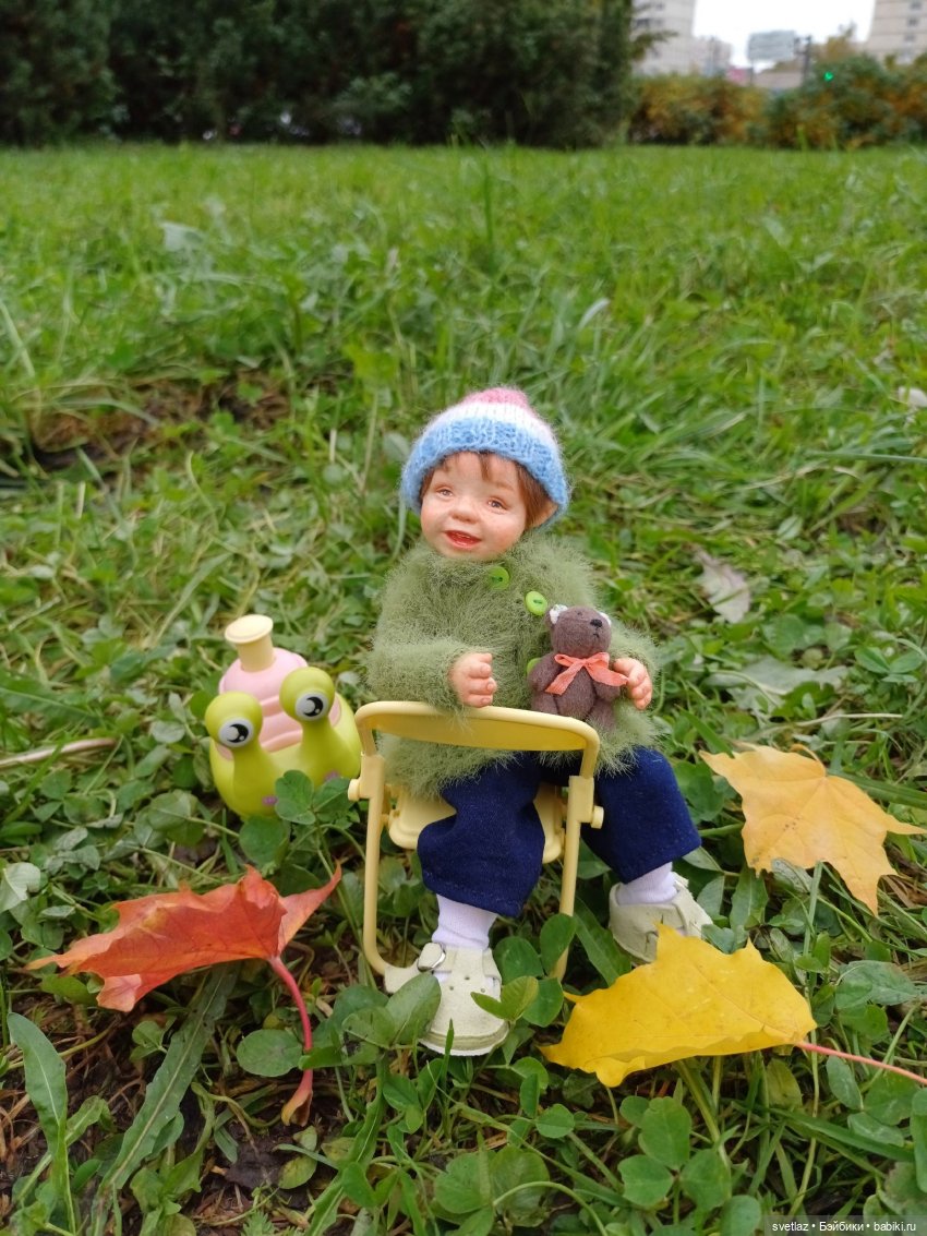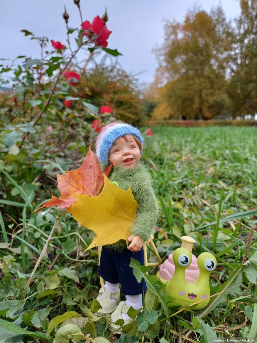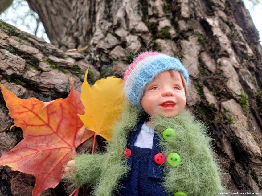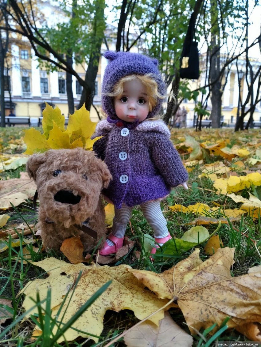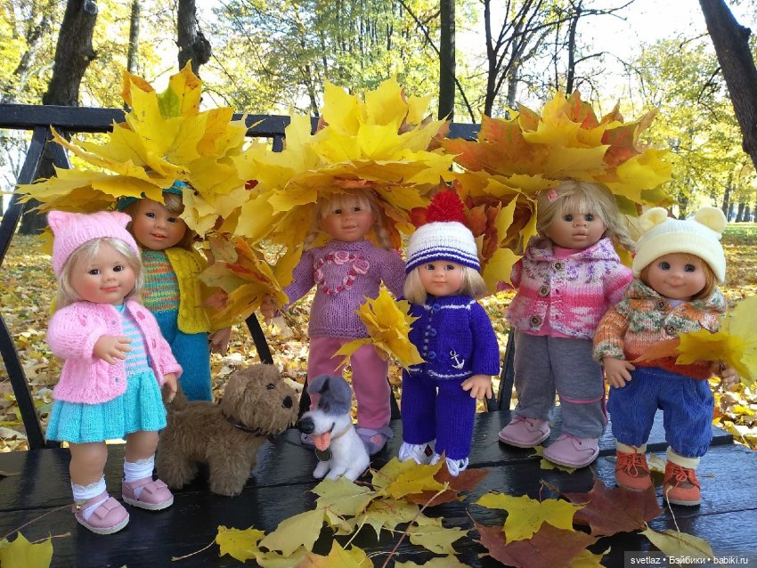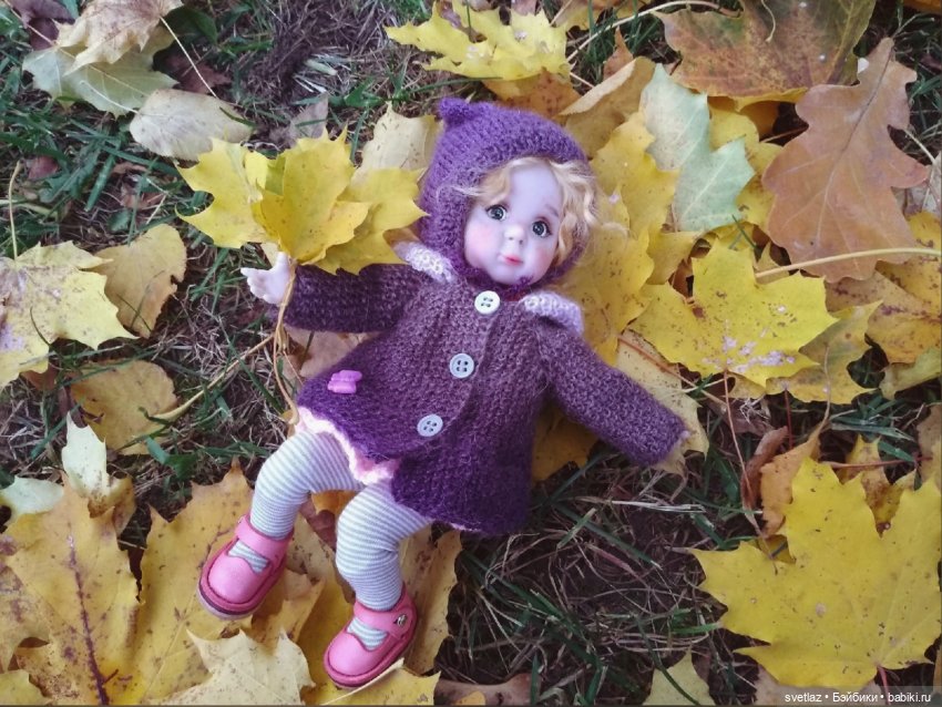 Наряд собрали из того, чем другие куклы поделились, поэтому и такие пестренькие, как осень. Только футболочка и штанишки Васины.
