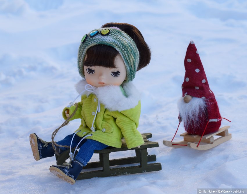 Фиошенька все праздники мечтала на саночках покататься. Но на улице холодно, а у малышки только летняя одежда, вот беда! Из зимнего — только шапочка, которую Фифи надела и отказалась снимать. Ожидая прогулку, так и ходила: в сарафане и теплой шапочке. А то вдруг кто из малышей украдёт…