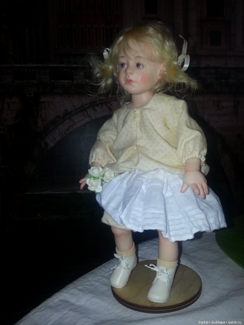 Здравствуйте, дорогие бейбиковцы! Сегодня я наконец доделала последнюю куколку-малышку в антикварном стиле. Её высота тоже 16 см. Головка подвижная. Тельце мягкое, набивное. Одежда съемная, обувь нет. Подставочку смастерила специально для этой куколки. Приятного просмотра!