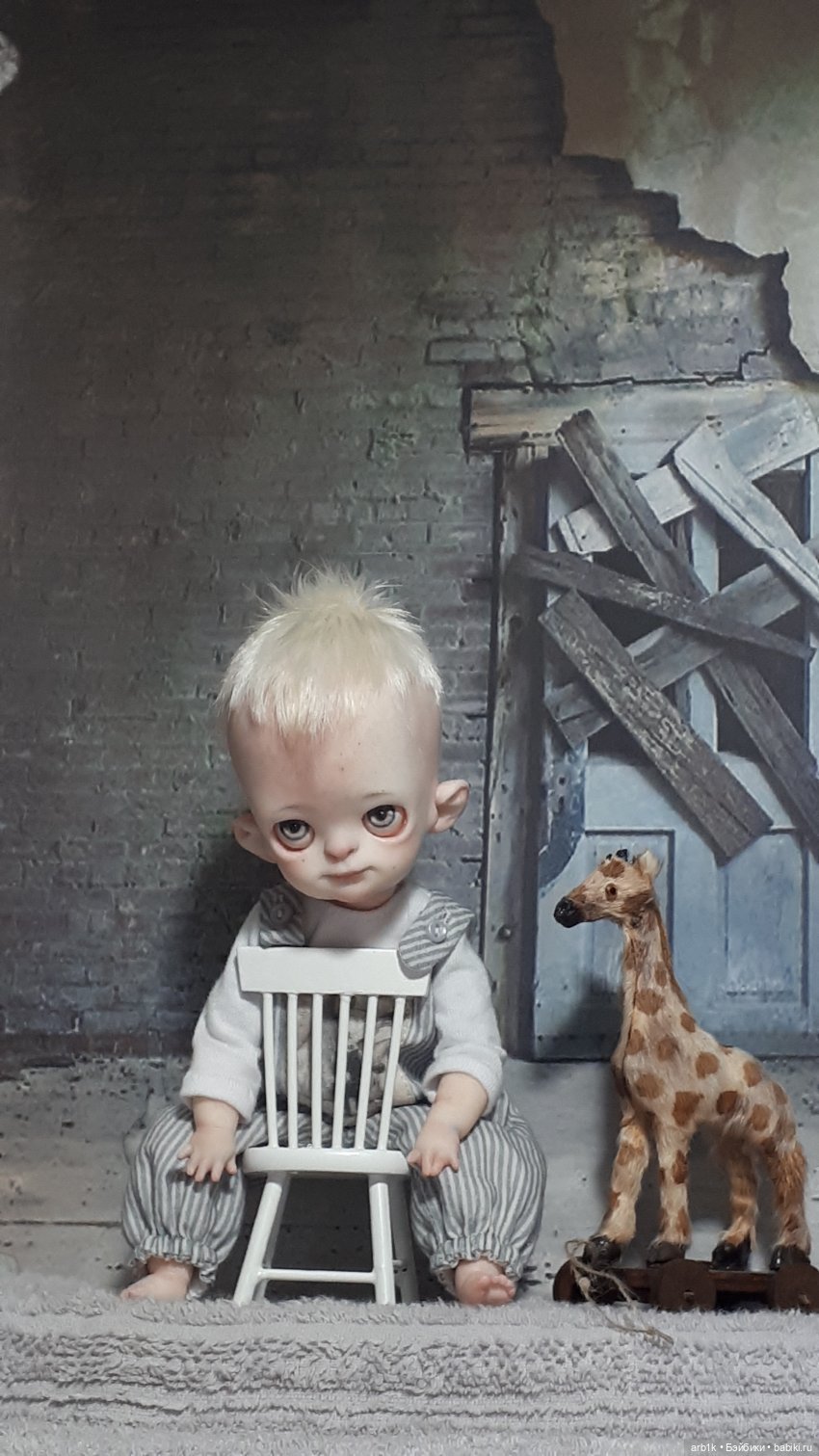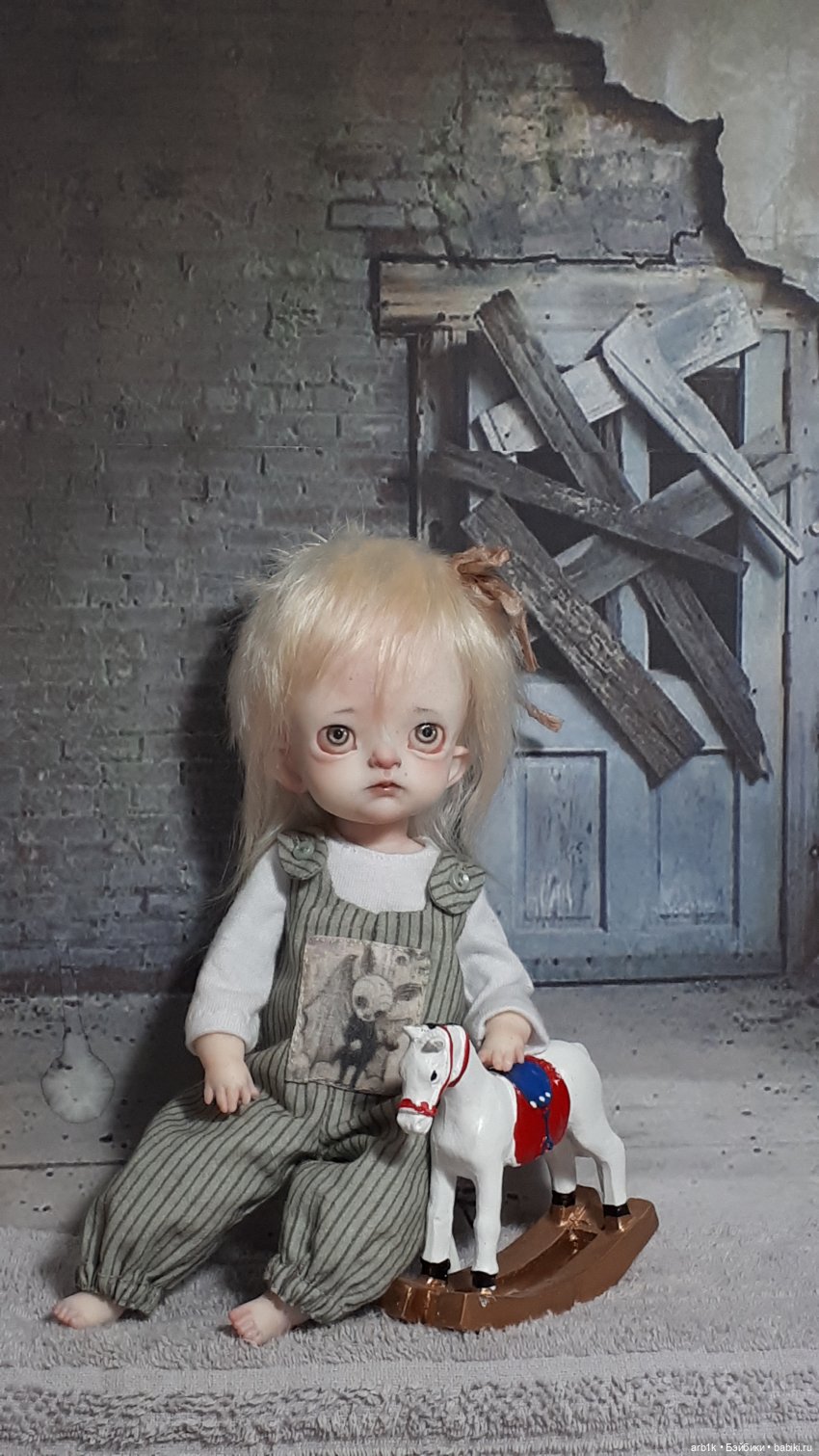 Здравствуйте, дорогие бейбиковцы! Сначала, как всегда предупреждение, о том что в топике страшилочка. Тем кто такое не любит, лучше пройти мимо, остальным добро пожаловать! Эту привиденьку-страшилочку зовут Дайна. Её высота с подставкой примерно 27 см, без подставки 26см. Тело тканевое, по типу «кукол болтушек». Ножки закреплены по переду. Глаза ручная роспись. Волосики козочка, приклеены. Платье и штанишки снимаются, обувь и носочки нет. Одежка сшита из новых хлопковых тканей, искусственно состарена и тонирована. Подставочка идет в комплекте. К критике отношусь нормально, если она по качеству работы, а не на тему «страшилки это фу...» Приятного просмотра!