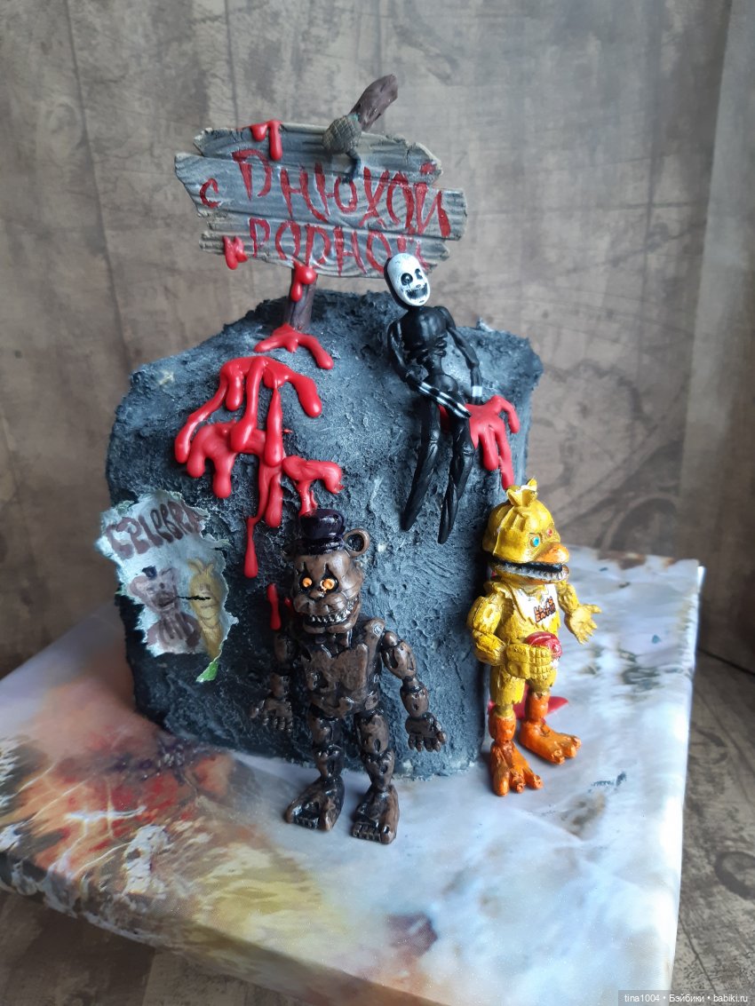 уродцев, чудиков, когда заказали торт на тему аниматроников (тогда же впервые о них узнала). Судьба моих Фреди и Чики была печальна. Ваш Фокси очень похож.Торт бесподобен!!! Чика и Фредди точь в точь как оригинальные фигурки (разве что покраска отличается), Вы точно сами их сделали?)) А то я оооочень удивлена)))