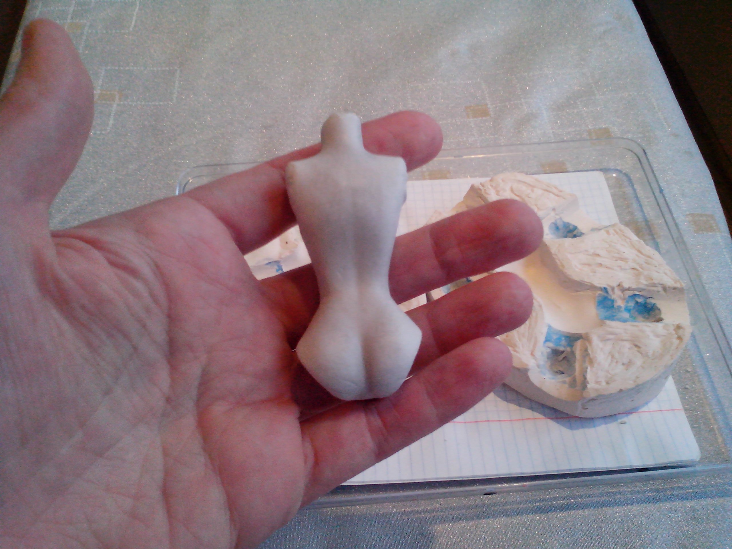 Воспользовавшись МК Марии Жуковой ро снятию гипсовых форм, попыталась сделать формочку со своей пластилиновой тушки. С первого раза у меня ничего путного не получилось, впрочем как и со второго. Результат третьей попытки меня более-менее удовлетворил. Это не совсем конечный результат. В МК Мария делает формы под литьевые пластики, а потому делает сразу втулки в полые части… я зачем-то тоже повелась на эти втулки, а сейчас понимаю, что для меня это не надо данном этапе. Доделывать гипсовые втулки сейчас не буду, а отверстия под них подготовленные замну пока пластилином