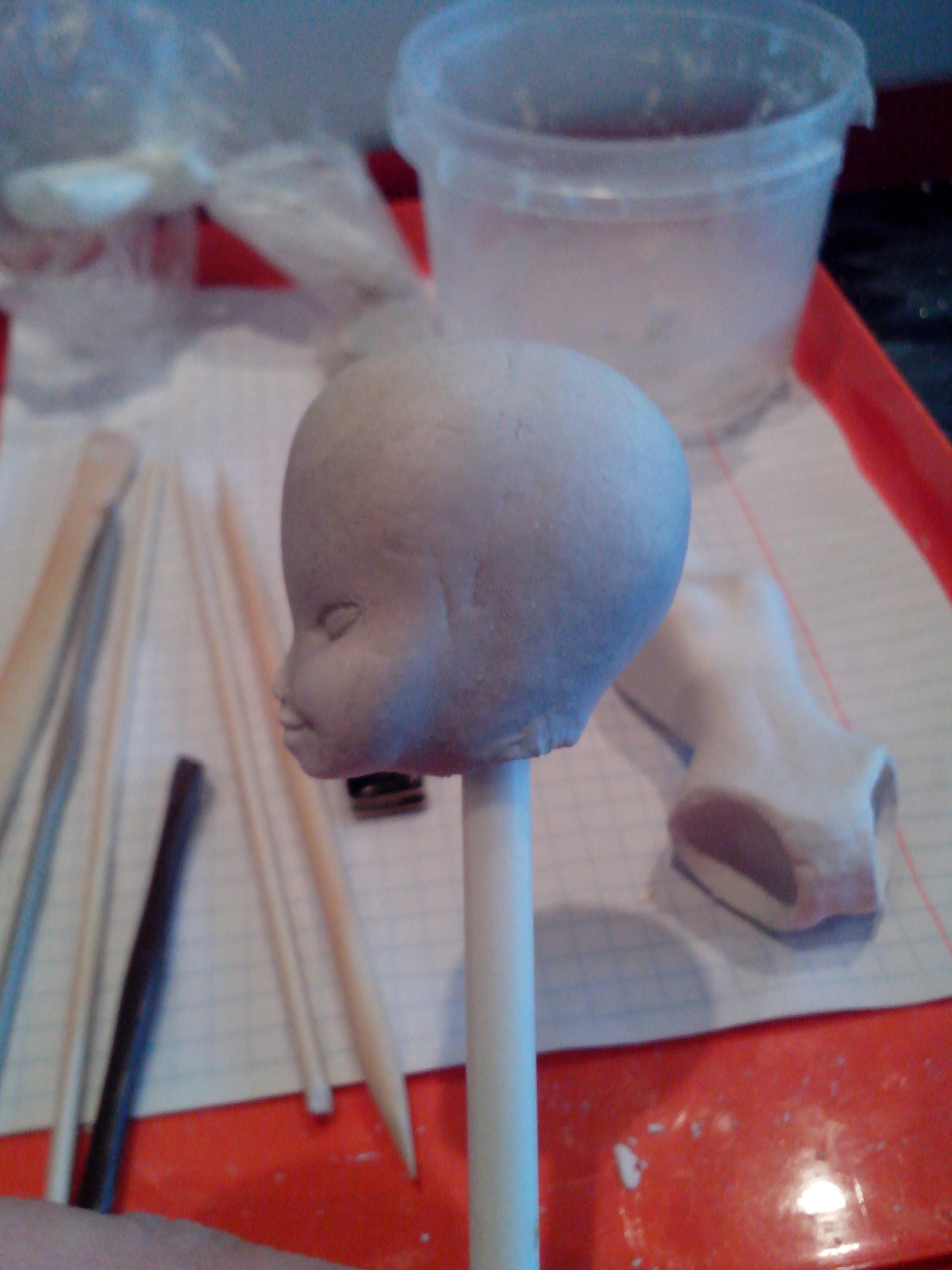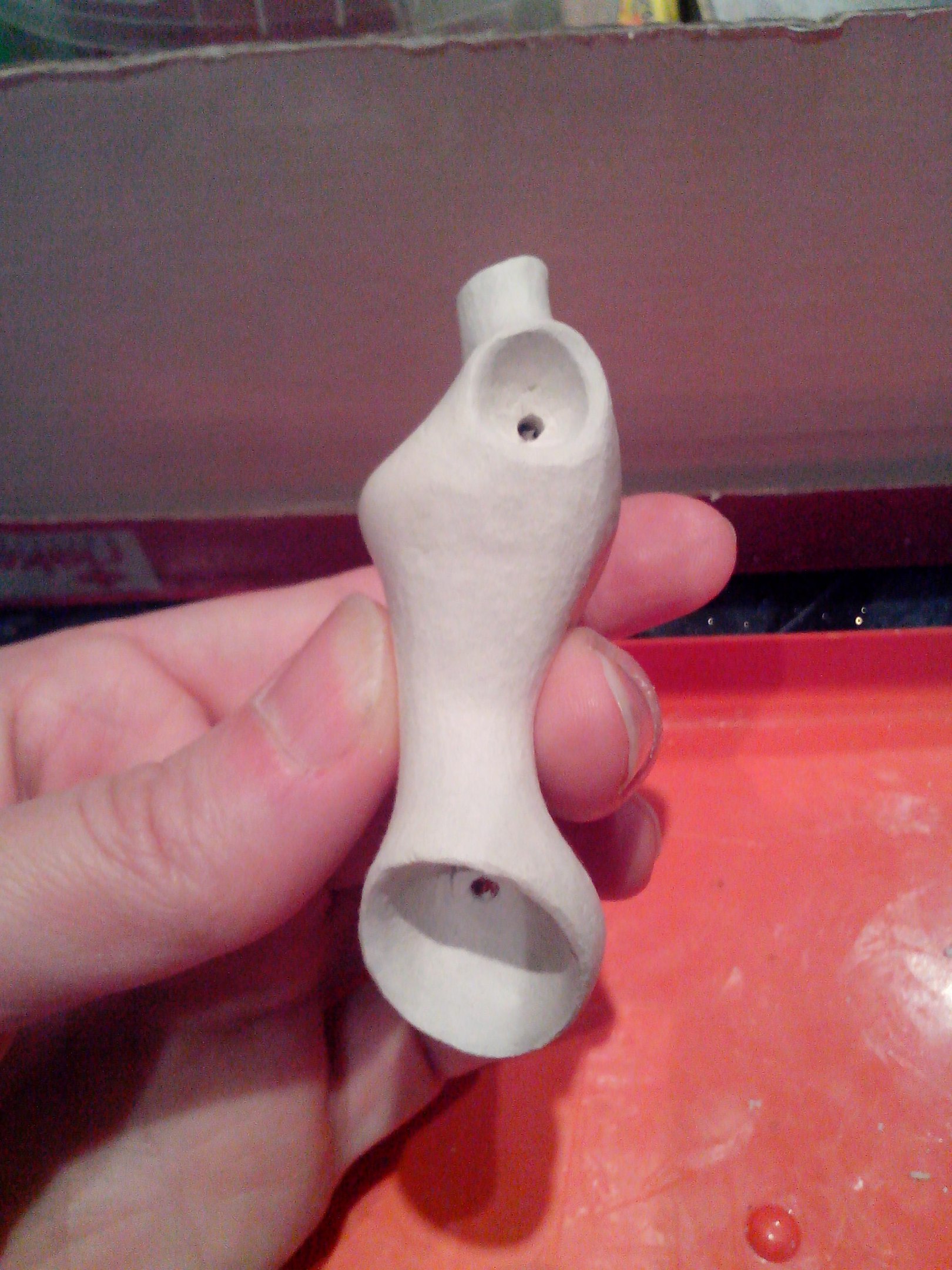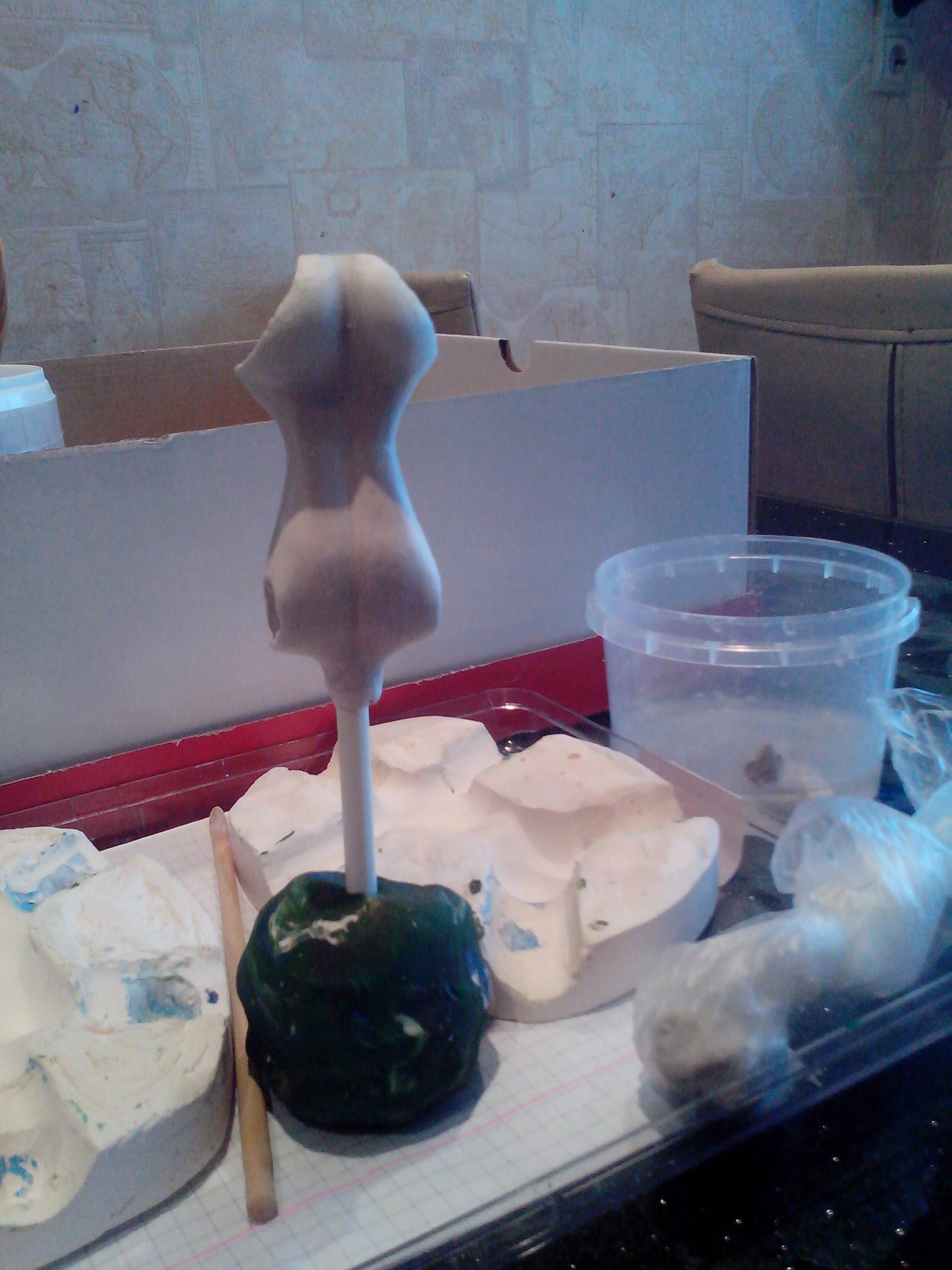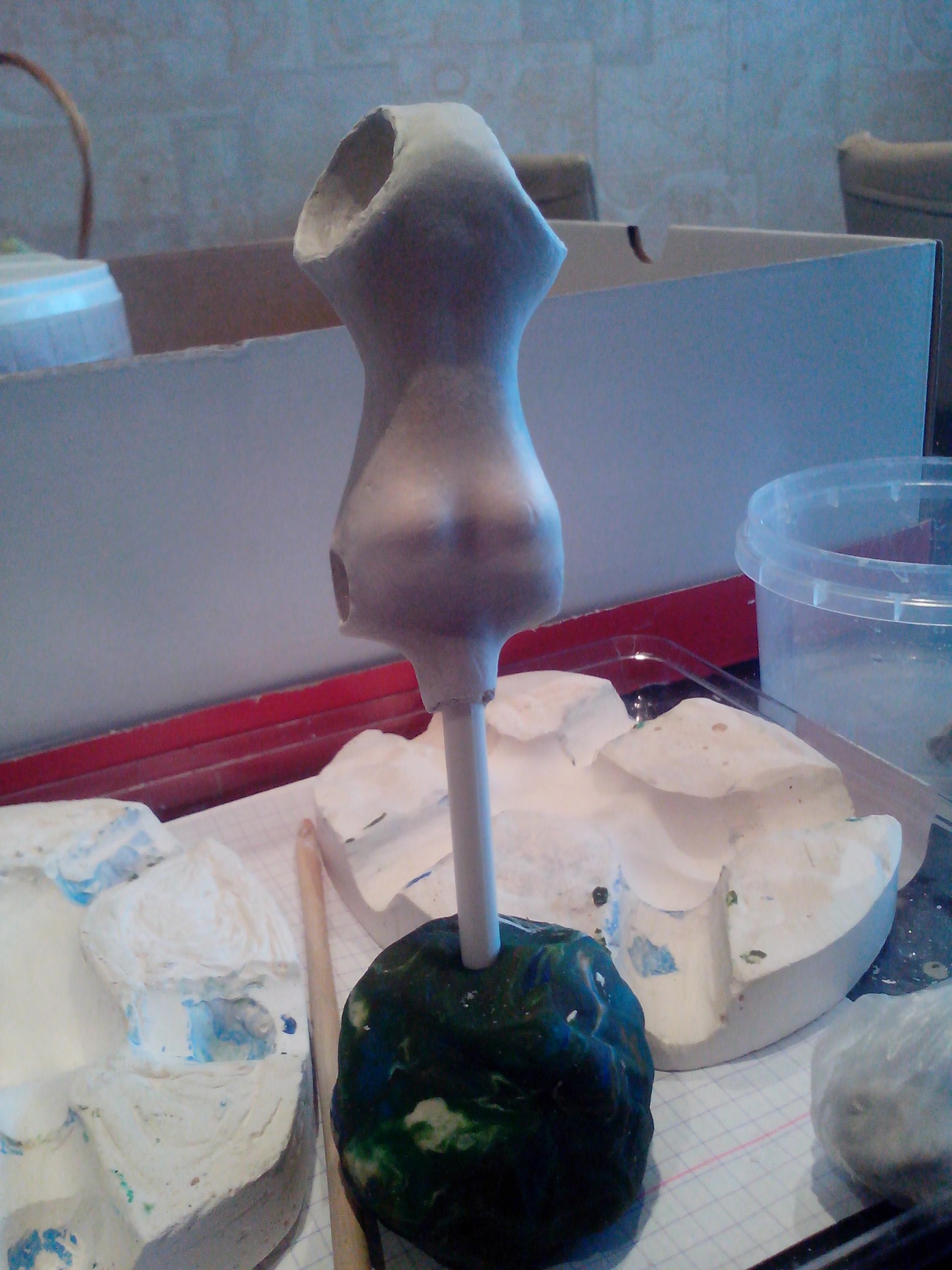 Слепила новое тельце. Благо, что гипсовую формочку сохранила. При отминке вставила в массу пластмассовую спицу, чтобы сразу было отверстие по центру. А еще сразу по мокрой массе вырезала шарнироприемники… вооот…