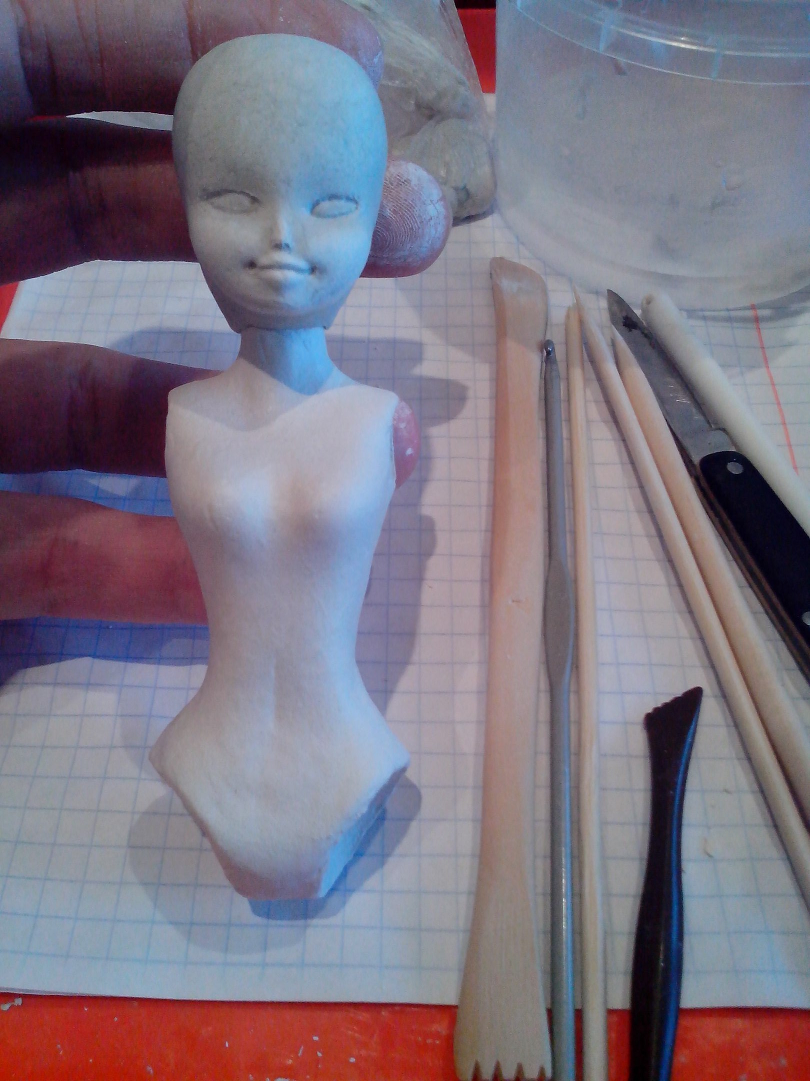 Опробовала гипсовую формочку. Потом долго пришлось ровнять швы и все тельце целиком. Формочка все же получилась не очень хорошей… Из-за неудачных попыток сделать гипсовую формочку, мое мягкое пластилиновое тельце каждый раз немного сминалось, и его приходилось каждый раз немного подправлять — в результате оно стало несколько иным, чем первоначальный вариант — вот только не снимала ход всего процесса.