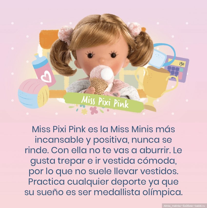 Мисс Пизи Пинк — Miss Pisi Pink — эта милая куколка любит спать, поэтому уверена, что ей нравится устраивать пижамные вечеринки со своими друзьями. Она очень забавная маленькая девочка, и она всегда придумывает самые оригинальные игры. Её любимый цвет- розовый, и она любит панд. Малышка любит сладости, но, прежде всего, она не может устоять перед черничными чизкейками.