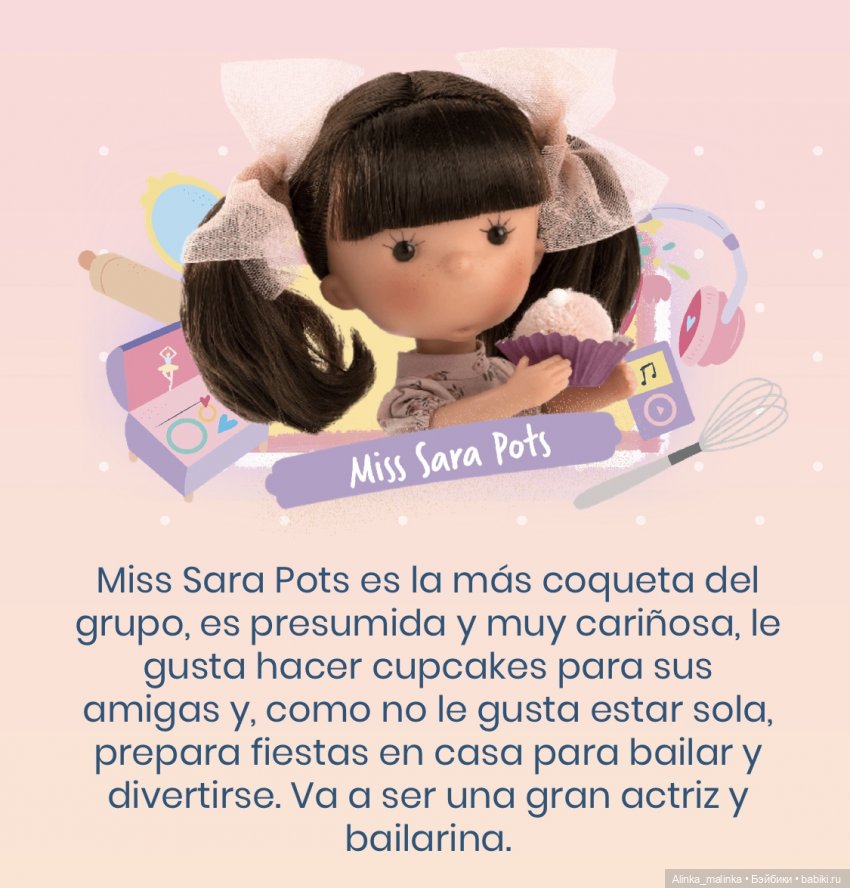 Мисс Сара Потс — Miss Sara Pots — очаровашка, которая любит готовить и создавать новые рецепты десертов, чтобы поделиться с друзьями. Всё что она готовит, очень вкусно, её кексы имеют отменный вкус. Эта маленькая девочка хочет готовить вместе с тобой :)