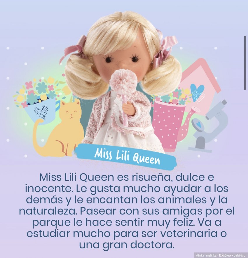 Мисс Лилли Квин- Miss Lilly Queen- любит улыбаться и дружелюбно относится ко всем мисс Минис. С ней очень легко заводить друзей, её чувство юмора очень заразительно :) Эта маленькая куколка любит ходить в кино, чтобы посмотреть любовные фильмы и комедии. Её любимый цвет- белый, и она любит котят! Её мечта- познакомиться с Парижем и попробовать там все вкусные десерты. Она действительно любит сладости, особенно лимонный пирог!!!